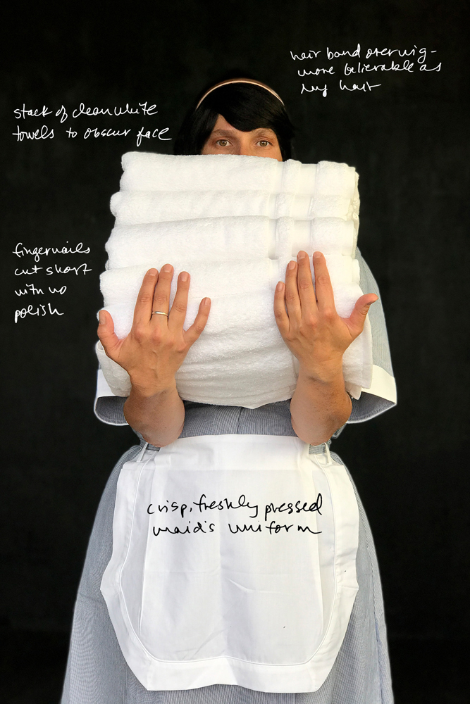©jessamyn lovell, Motel Maid Disguise (AKA “Joyce”), 2021 Ageless, nameless motel maid who blends right into any motel environment because no one notices “the help.” The stack of towels allows me to obscure my face, becoming even less human and noticeable. I used this disguise while investigating a human trafficking case in a local motel.