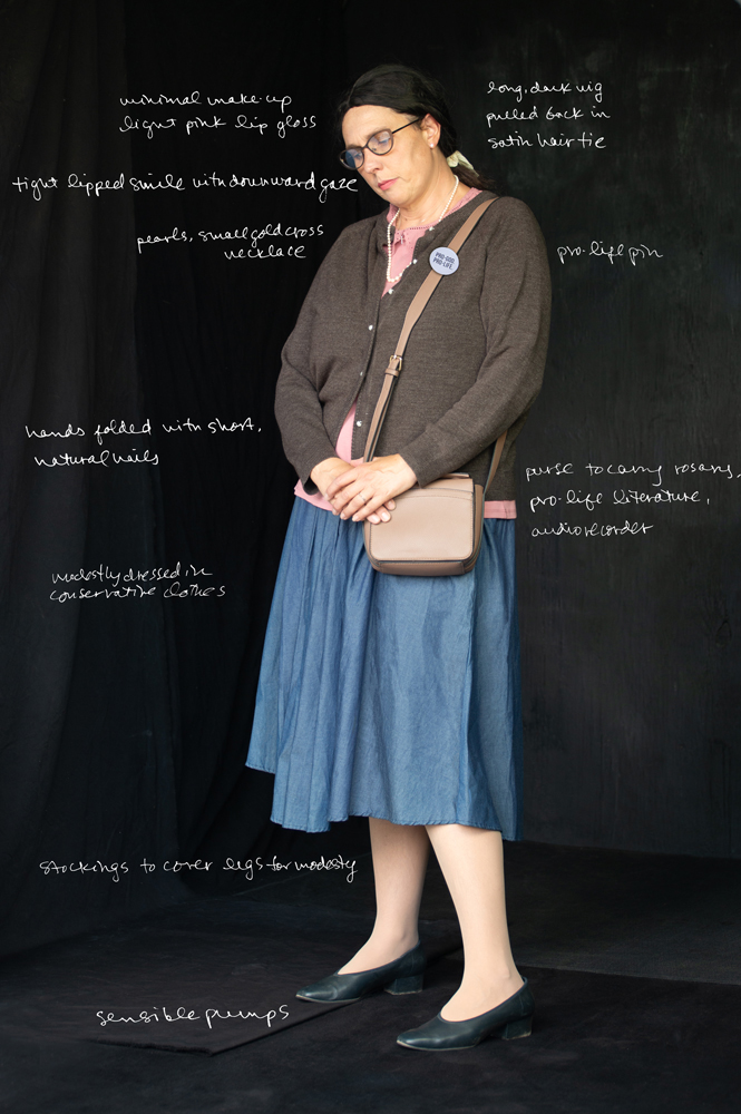 ©jessamyn lovell, Pro-life activist Disguise (AKA “Laurel”), 2021 “Laurel” is an ageless conservative pro-life activist. She is shy but feels strongly about her beliefs. I used this disguise while embedded for a week within the most powerful national pro-life activist group. It was literally the hardest case I pursued. I went to church to prepare and integrate into a nearby parish I knew was very pro-life. I used my real legal first name to stay closer to the truth while “passing” as one of the activists. I attended prayer circles, fundraising dinners, and a press conference (on the campus where I teach).