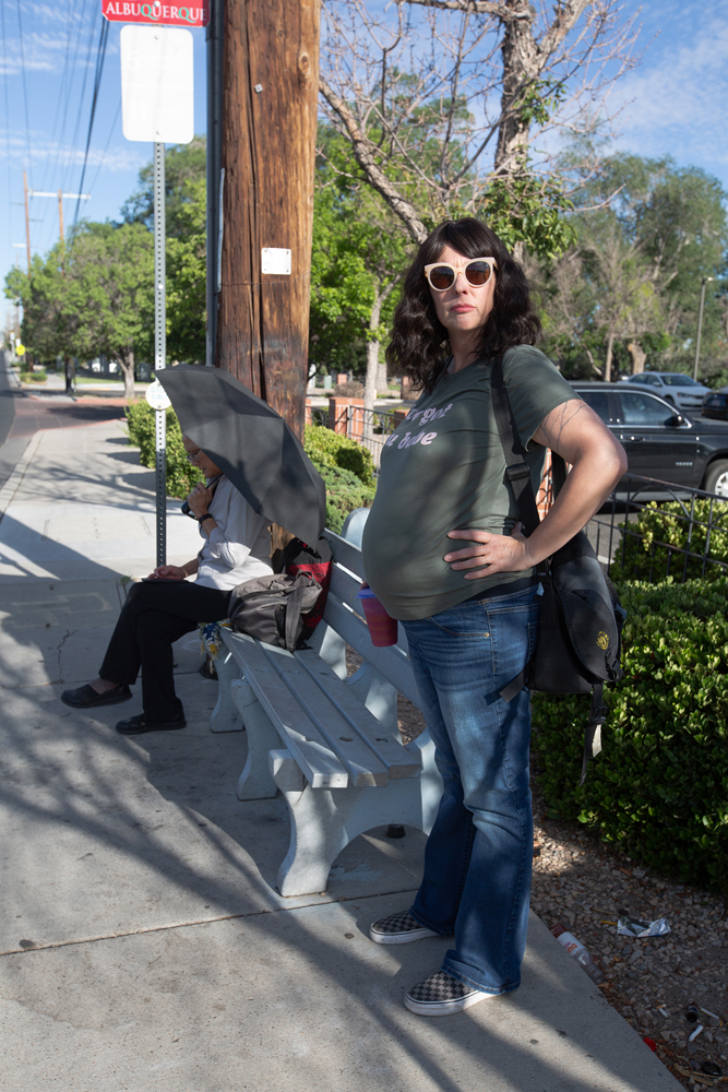 ©jessamyn lovell, Pregnant Disguise (AKA “Lisa”), 2023 Lisa works well on surveillance in all sorts of situations because passersby perceive vulnerability in a pregnant woman, which allows me to sit for a long time without being noticed or seen as suspicious. I invested in the foam pregnant belly because when I was pregnant, I used that to my advantage trying to track down Erin Hart, the woman who stole my identity. She makes it easier to do surveillance in very public, high-traffic locations like a bus stop, hanging outside of a store, leaning against a car, and so many other similar situations.