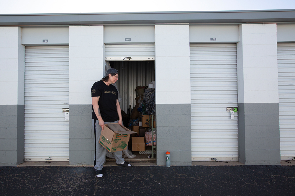©jessamyn lovell, Storage Space Disguise (AKA “Dee”) Field study, 2024, This disguise was created for use in one particular case and has since become yet another all-purpose disguise. The case required me to show up to the storage space of someone who owed my client money. The task I was charged with was to document and witness the storage unit owner as they went through their possessions assessing what might be worth any money so they could sell it and pay their debt to my client.
