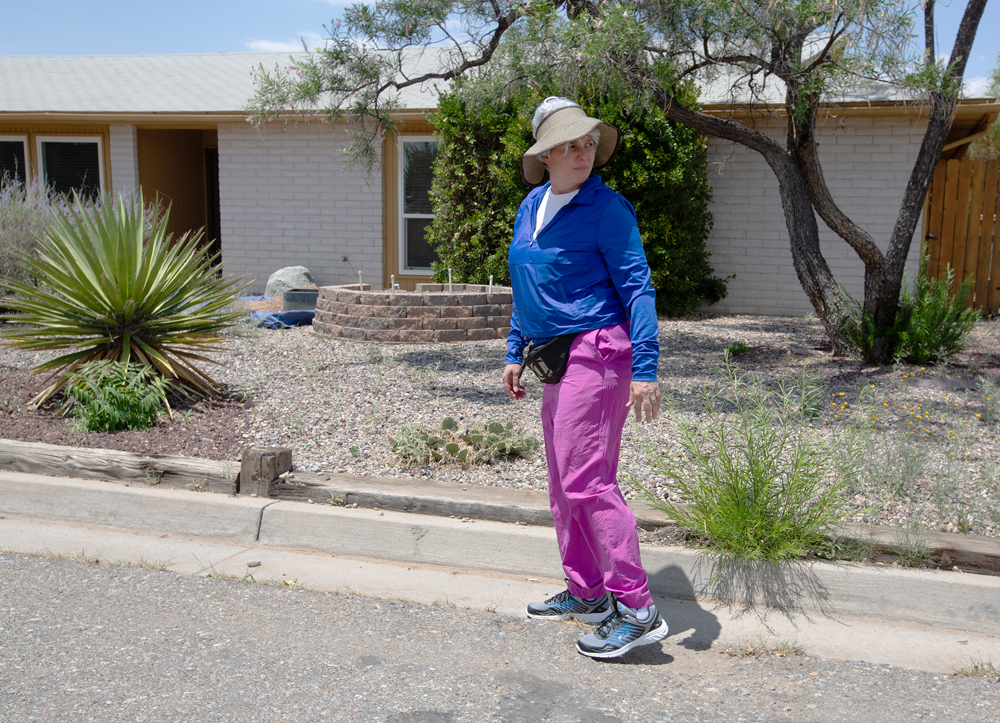 ©jessamyn lovell, Nosy Neighbor Disguise (AKA “Theresa”), Field study, 2023, Theresa is definitely a kind of “Karen.” I affectionately call her a “nosy neighbor” but she is also probably a gossip and calls out anything she thinks “looks suspicious,” making her potentially problematic. Although her snooping behavior is risky at times, her age, class, and whiteness renders her invisible and her entitlement hints at a slight authority allowing her to gather information and “pass” as belonging – especially in suburban neighborhoods.
