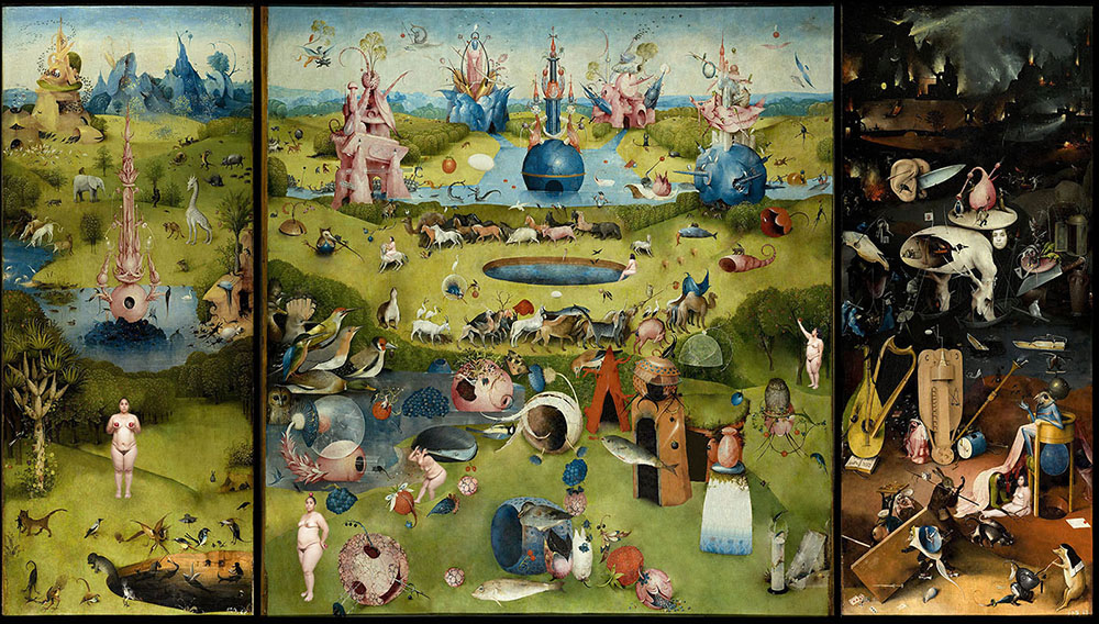 The perfect female body resembles paradise, the perfect world in which we must ever dwell. Guilt, lust, almost all forms of sin are attributed to women from their creation in paradise and their exile to the world. There was no turning back. In “On the Garden of Delights” I have erased all human figures (from the original triptych) to place myself in the landscape without assuming the guilt attributed to Eve. Rejecting the ideal of beauty imposed on the female body, it alludes to the posture of Bosch as the tree-man who turns to see the world become hell, but now as a woman whose hell is her own body.