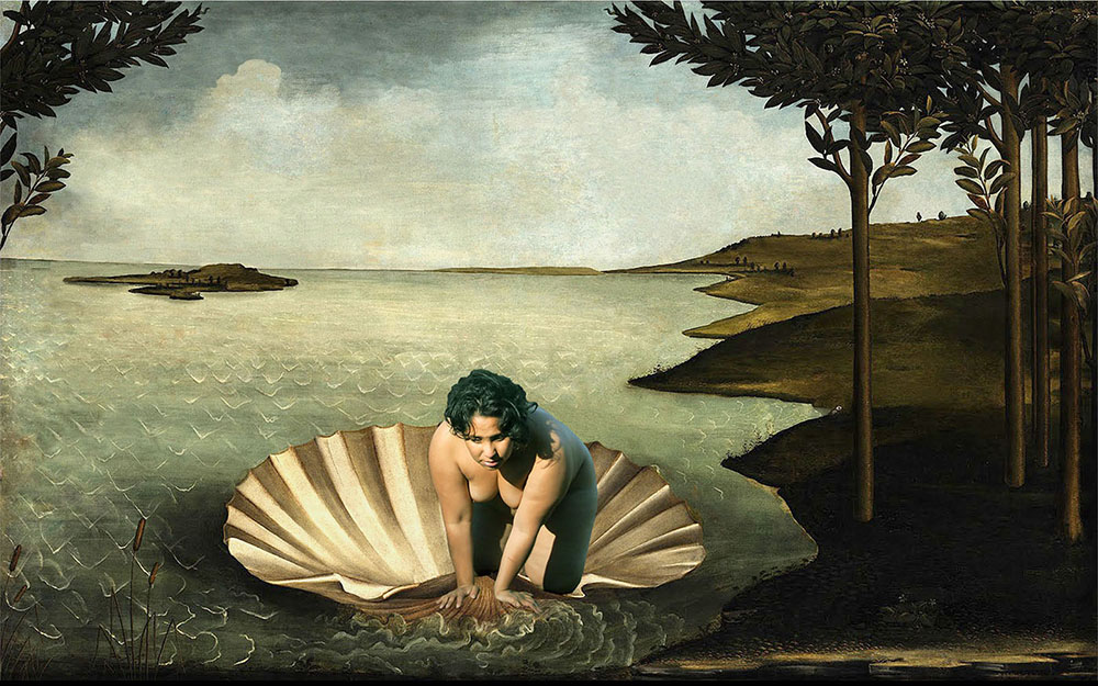 ©Carol Espíndola, “Sobre el nacimiento de Venus I” (On the Birth of Venus I), from the series La Atlántida o La utopía del cuerpo femenino (Atlantis or The Utopia of the Female Body), digital collage, 2015 Venus does not appear enclosed in her shell, instead she emerges from the sea, like Atlantis.