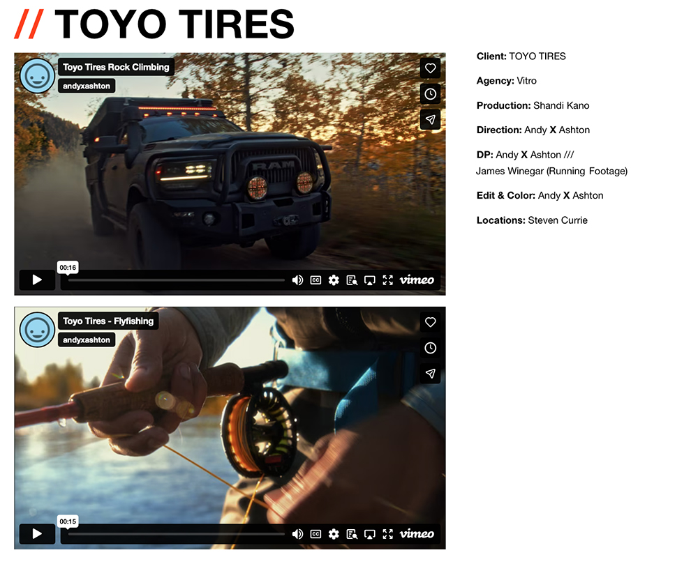 © Andy Mahr, Andy X Ashton, Toyo television commercials “How was your weekend” that helped launch three new All Terrain Toyo Tires. 3-day shoot throughout Utah. Highlighting different adventures including fly fishing, sand boarding, mountain climbing, trail running, and other outdoor activities, 2024