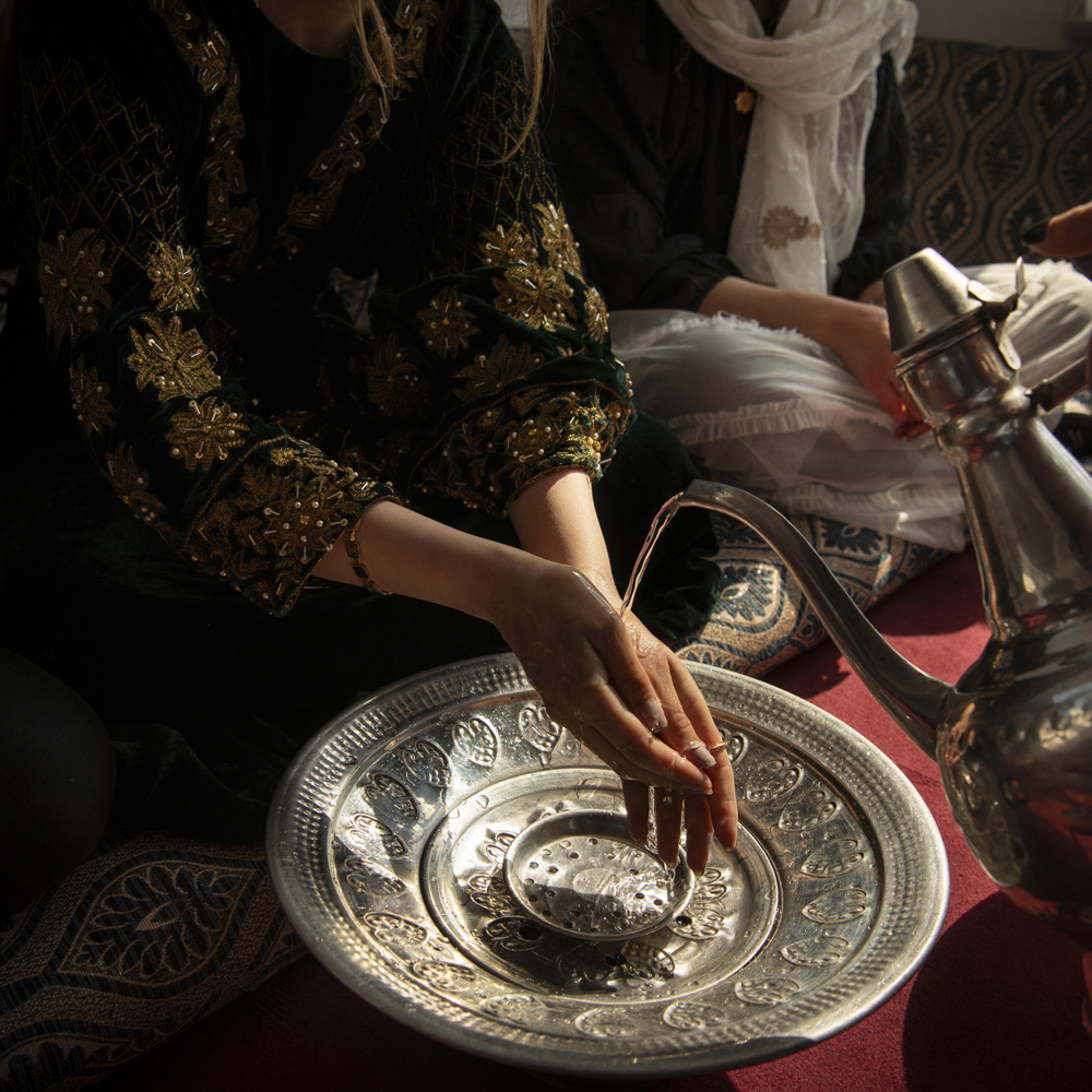 Kabul, Afghanistan, February 23, 2024. Guests washing hands before lunch at a small birthday party. Even small gatherings become acts of courage. © Kiana Hayeri for Fondation Carmignac