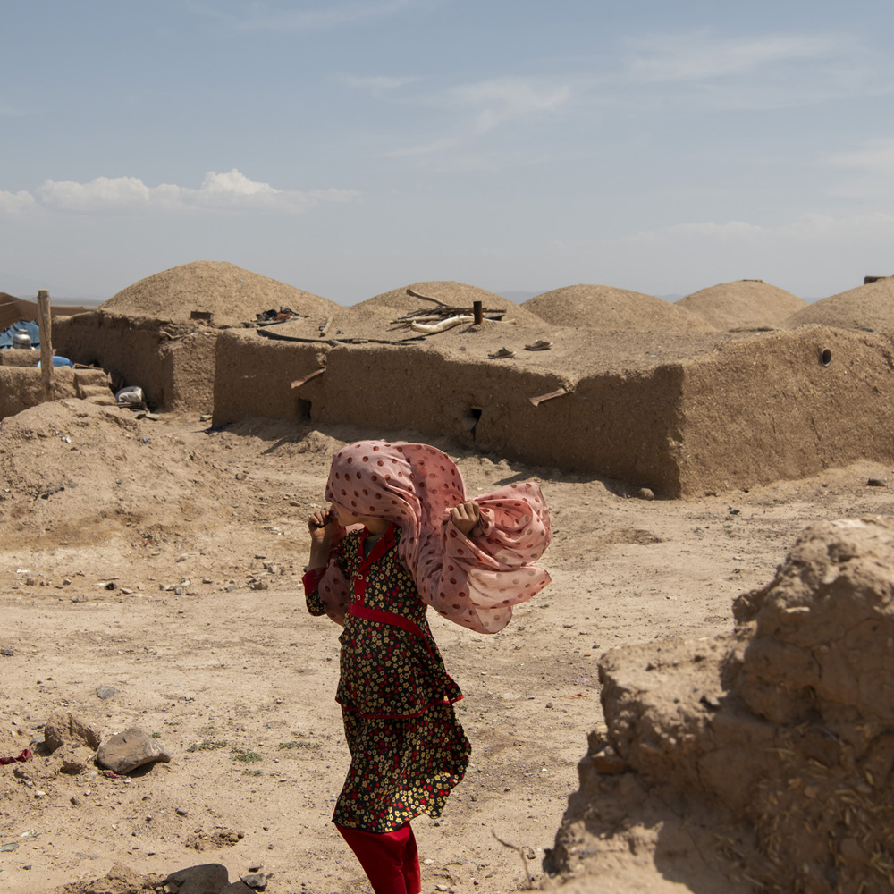 Enjil District, Herat, Afghanistan, April 23, 2024. A girl walks through rubble months after an earthquake devastated her village in Herat province. © Kiana Hayeri for Fondation Carmignac