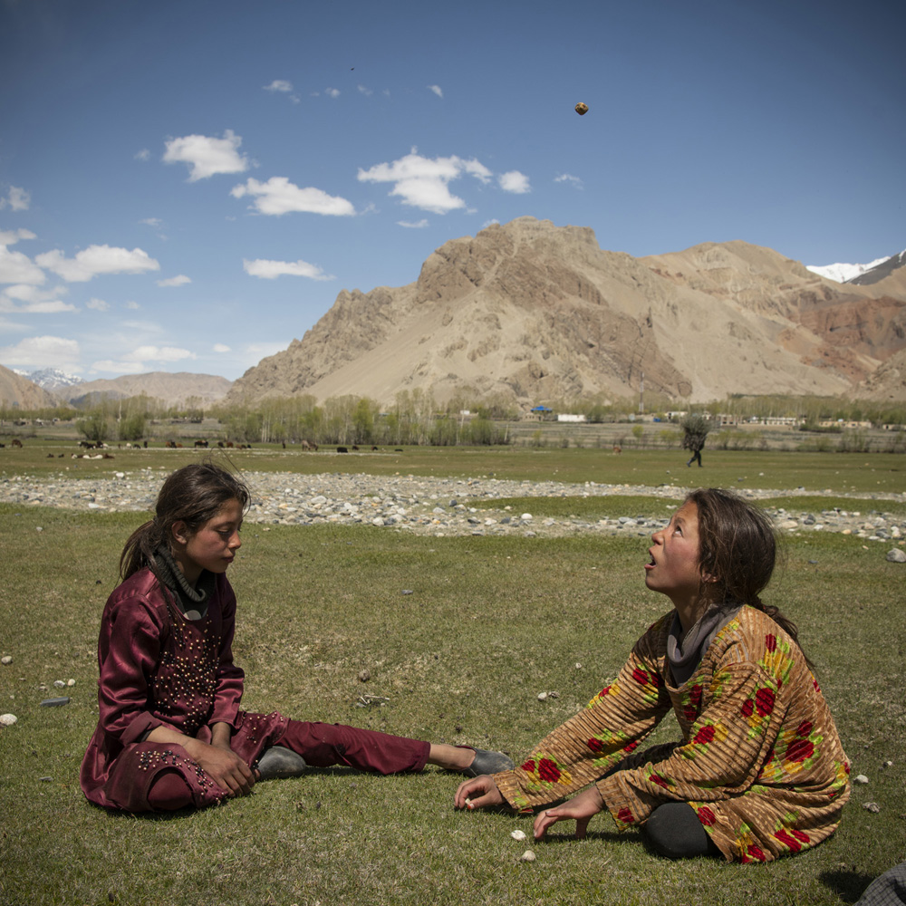 Badakhshan, Afghanistan, May 08, 2024. Masooma (8) and Zeeba (9) play 5 stones while herding sheep. © Kiana Hayeri for Fondation Carmignac