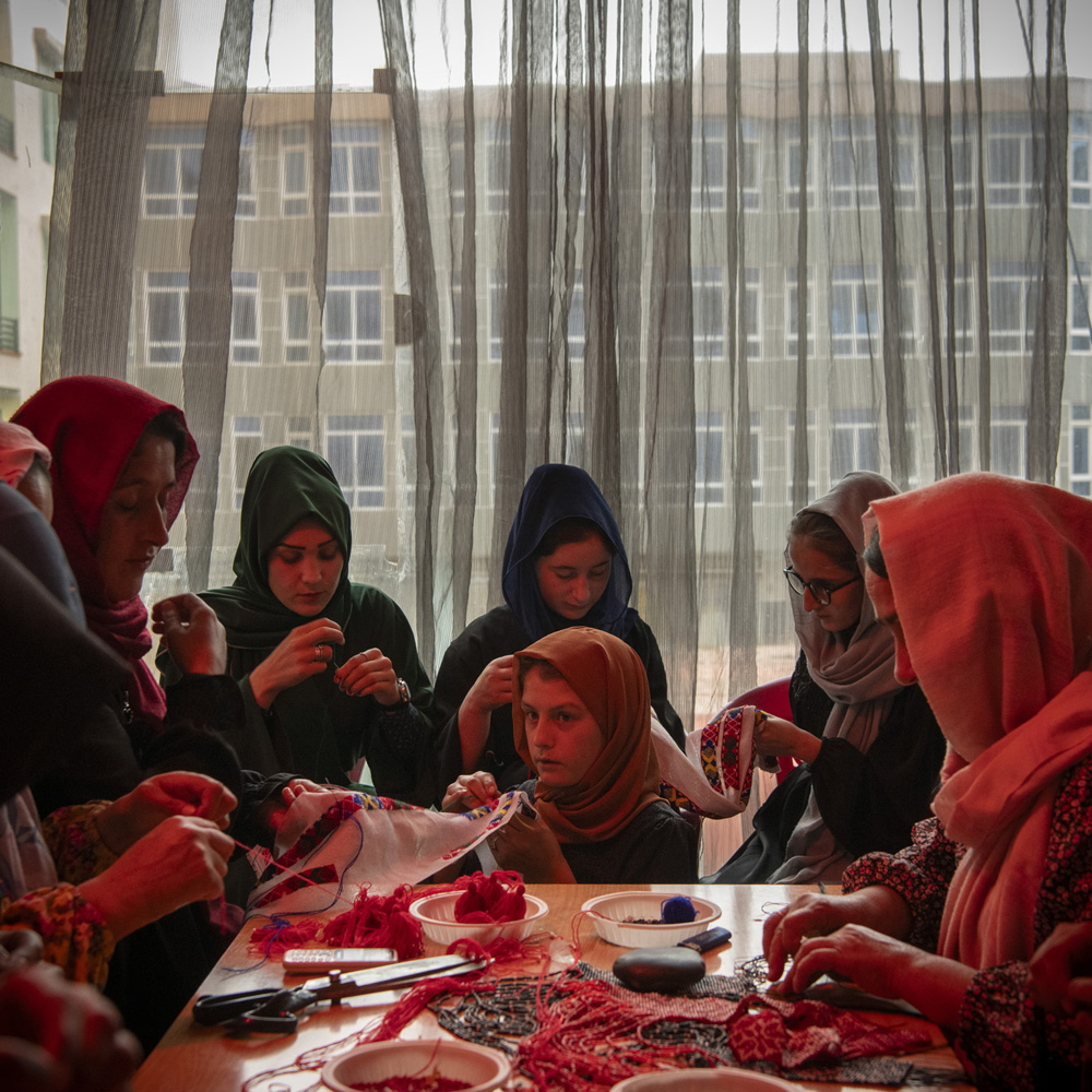 Zibak, Badakhshan, Afghanistan, May 11, 2024. Young women make traditional Badakhshi beadwork in Faizabad’s women-only market. © Kiana Hayeri for Fondation Carmignac