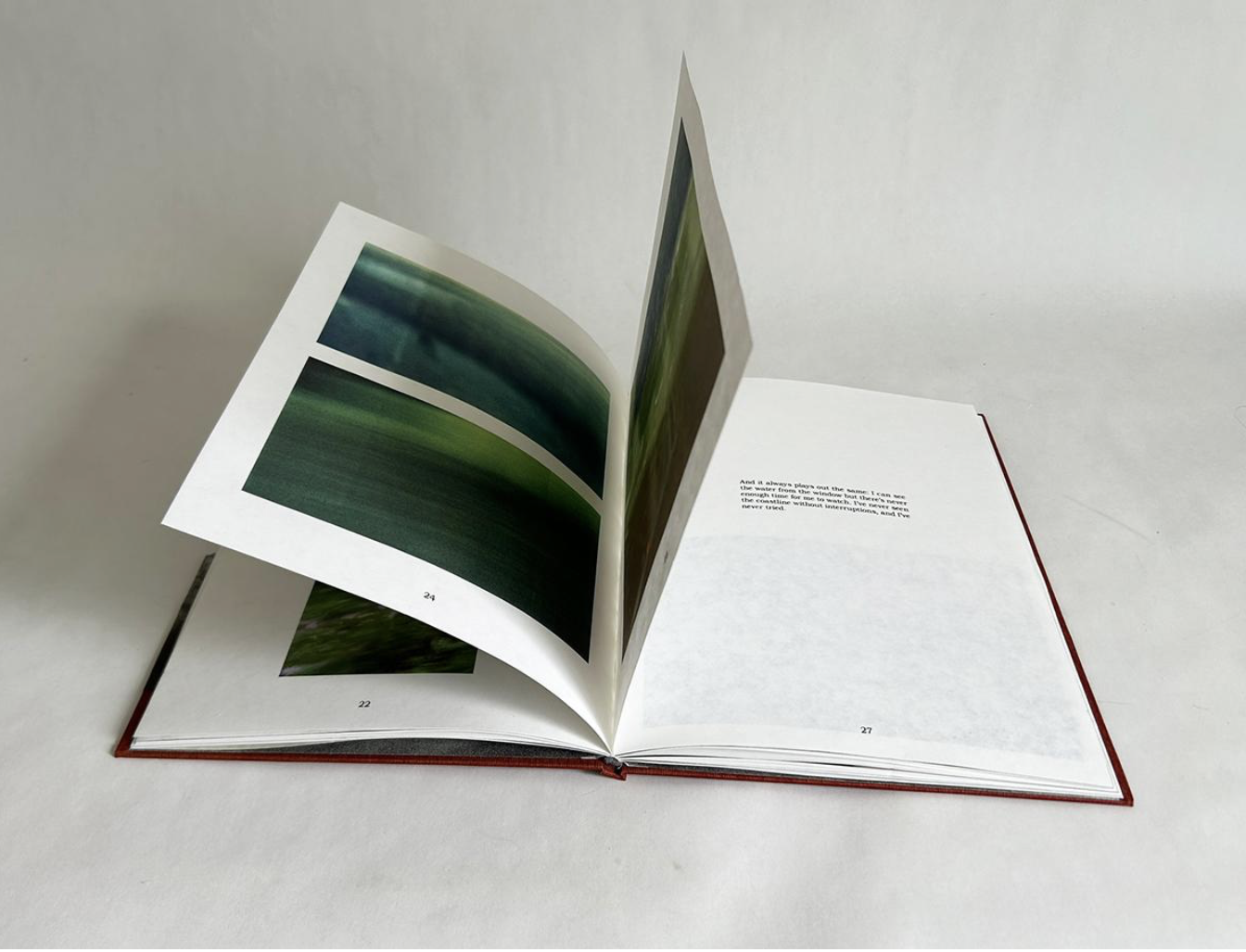 McCall Hollister is a museum worker, visual artist, and bookbinder. Working primarily through handbound photobooks, Hollister combines writing and photography to explore psychogeographical landscapes and transition. Born in Boston, Hollister grew up in mid-Michigan before returning to Boston for school in 2021. Hollister received their BA in Arts & Humanities from Michigan State University in 2019, and their Masters in Fine Arts and Museum Studies from the School of Museum of Fine Arts at Tufts University in 2024. They currently work as a freelance art handler and bookbinding instructor, based in Boston, MA.