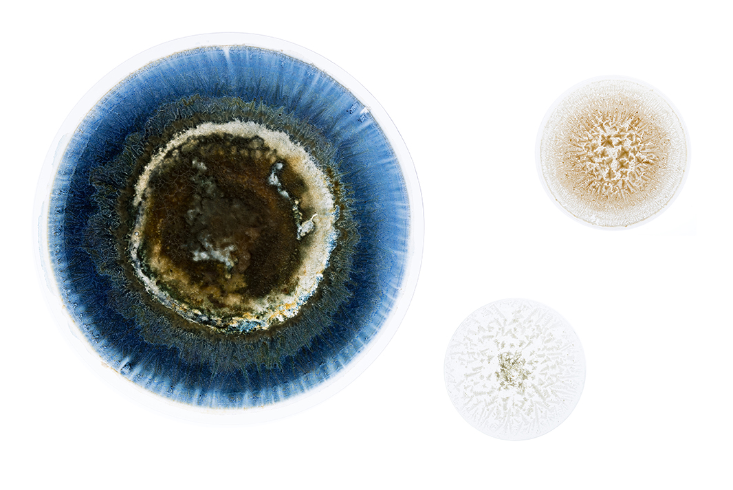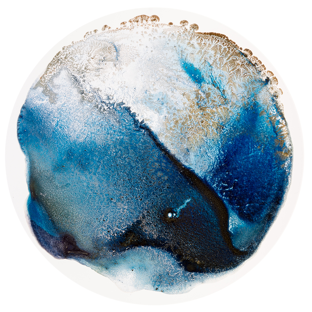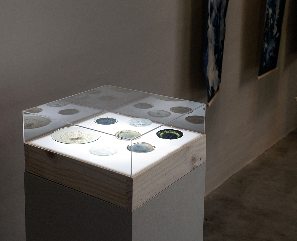 @Paola Dávila, Salar (Salt) series (watch glass), seawater sediments, Laminariales, and cyanotype emulsion on watch glass