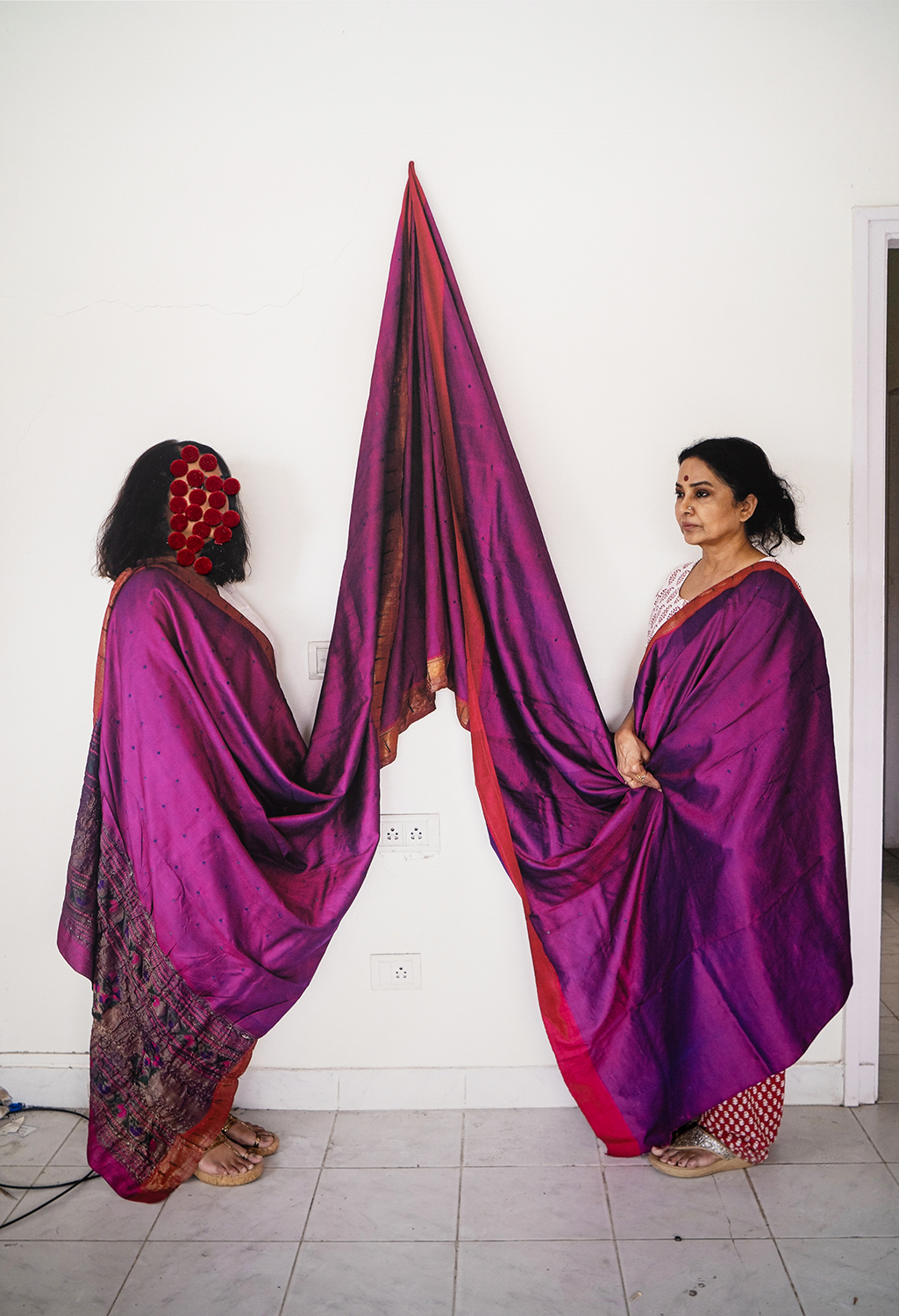 Yashoda Latkar uses self-portraiture, family photographs, performative video, and mixed-media installations to explore migration and identity. Her work reflects the experience of living in an in-between space—negotiating belonging, home, and displacement through multisensory cues of visuals, sound, texture, and smell.