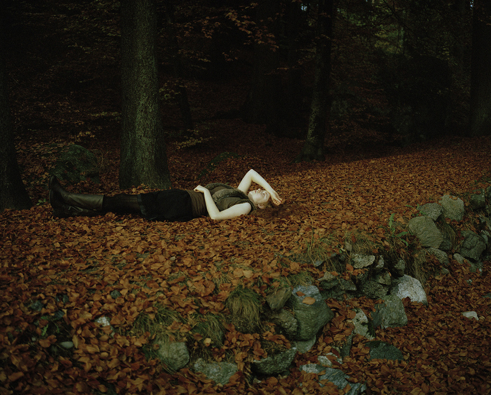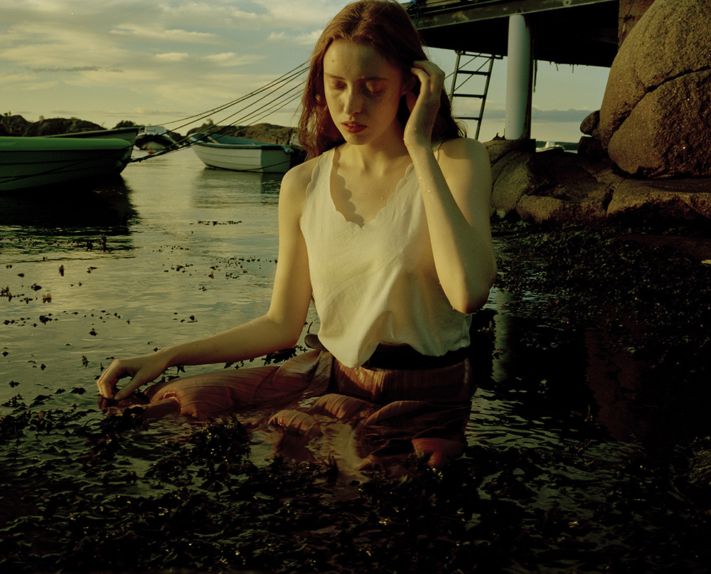 Color is fundamental because it comes directly from place, light, and season. I work only with natural light and analog film, which gives color a physical depth and softness that I trust. I do not manipulate color afterward. I rely on what the landscape gives. The palette belongs to the North — the sharp air, the long twilight, the muted greens, the shifting sky. These qualities create the emotional tone before the image is even made. The red hair becomes a natural intensity within this palette. It is visually strong, but it belongs organically to the landscape rather than dominating it. I have often felt a connection to both Edvard Munch and Nikolai Astrup in this respect — not stylistically, but in the sense that color is inseparable from northern light and emotional atmosphere. I do not seek dramatic color. I seek inevitability — tones that feel as if they could not have been otherwise. Color, for me, is never decoration. It is atmosphere.