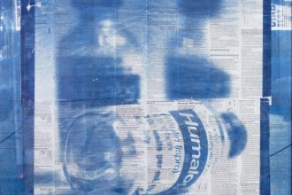 © Pauly V., Vials (1), film photography and cyanotype on insulin fact sheets and corrugated plastic, 34 x 26 inches, framed.