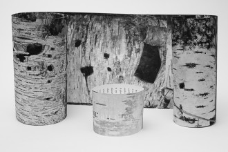 ©Dana Fritz, Betula papyrifera: an elegy, (2022, hand bound artist book,) takes the form of a scroll in which photographs of decaying, hollow birch trees are unfurled by a viewer.