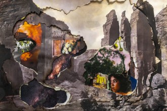 ©Naomi White, I Had My Recurring Dream Last Night, 2024 Original and found photographs, archival pigment prints, archival glue, fire and ash, encaustic 18×24”