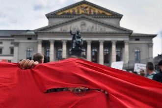 ©Matt McClain, Protest, A counter protester is seen peeking out from a banner during a pre-election rally for the Young Alternative for Germany which is affiliated with the far-right par