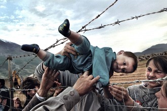 KOSOVO’S SORROW – ETHNIC CLEANSING “REUNION” Kosovar refugee Agim Shala, 2 years old, is passed through the barbed wire fence into the hands of grandparents at the