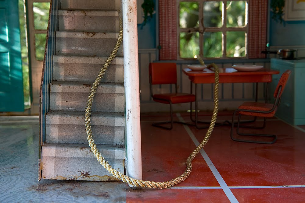 MANY ROOMS: These pictures are shot in a rusting tin dollhouse. This home serves as a generic domestic setting. For my purposes, it’s also a quirky enough stage-set to play the role of a heavenly home, the endpoint of life’s journey in any promise of an afterlife. I also find it to be a fitting laboratory for the working out of a host of problems inherent in a number of human ideals.