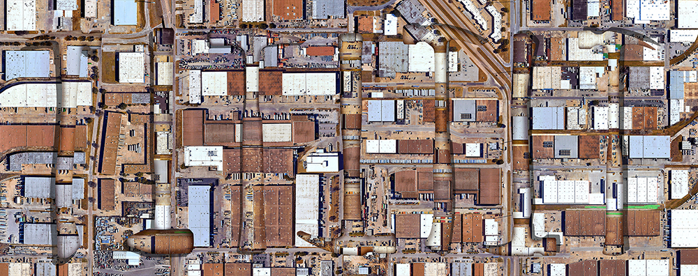 My photo landscapes, all derived from satellite imagery, do not idealize conventional beauty found in mountain vistas or pastoral valleys. Instead, they show unexpected beauty in urban settings often dismissed as eyesores.