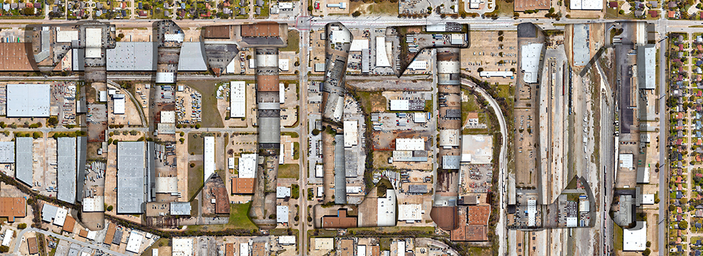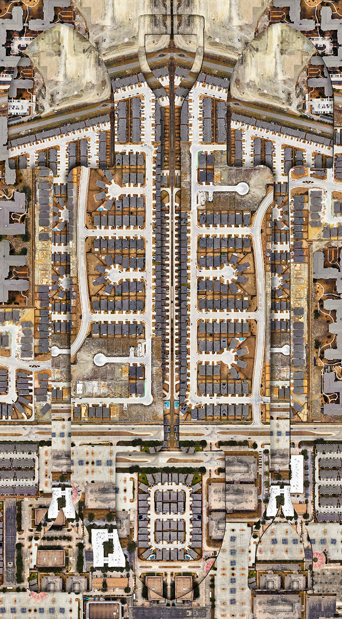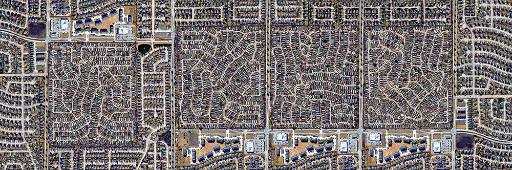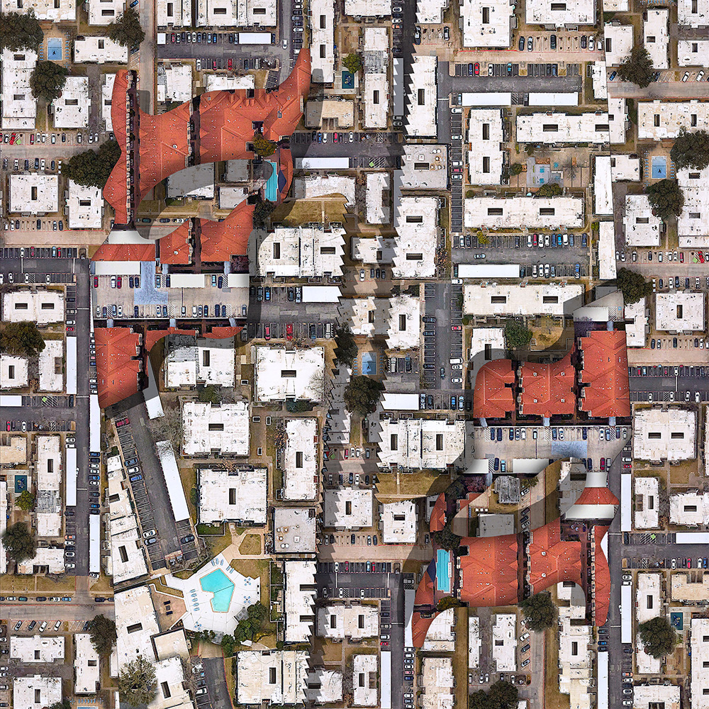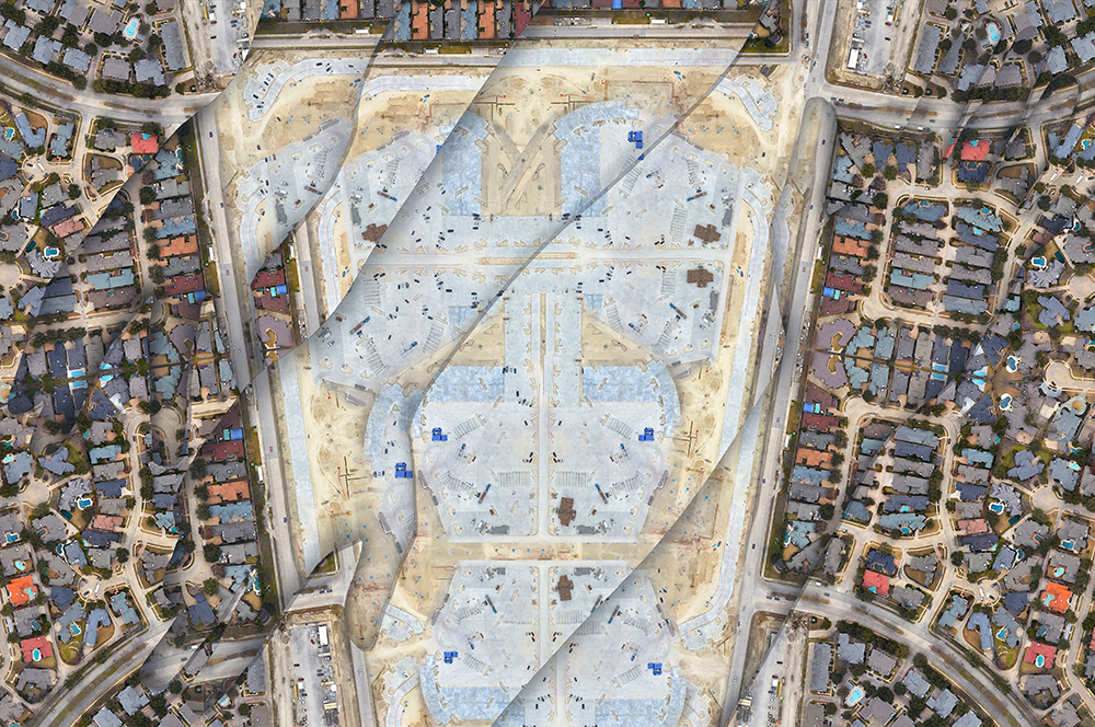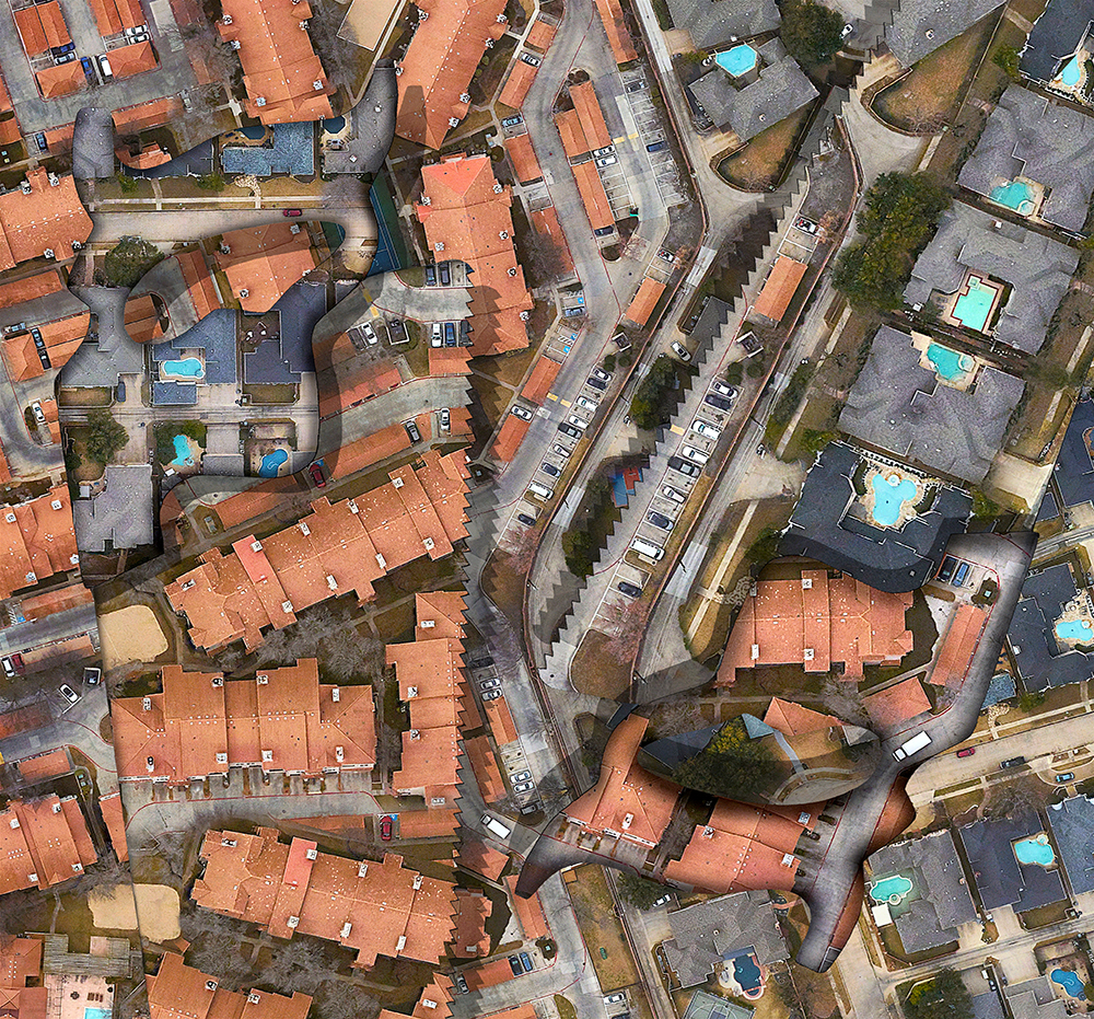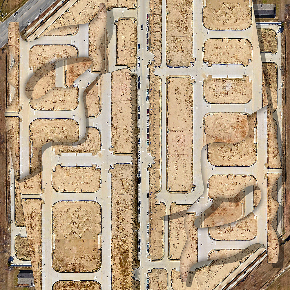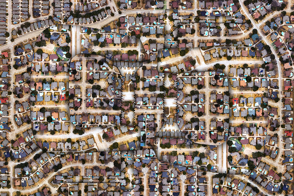 Tom Crawford is a visual artist whose work explores alternative conceptualizations of landscape art, mostly viewed from an aerial perspective. In his ongoing project, Overlooked, he rearranges satellite photos of vast residential and industrial settings with Photoshop to create entirely new urban landscapes. Many are overlaid with enlarged and carefully camouflaged hand tools that blend in with the vast urban settings below. By juxtaposing hand tools with housing developments and industrial parks, his artwork connects urban landscapes with hammers, saws, and shovels once used to make them.