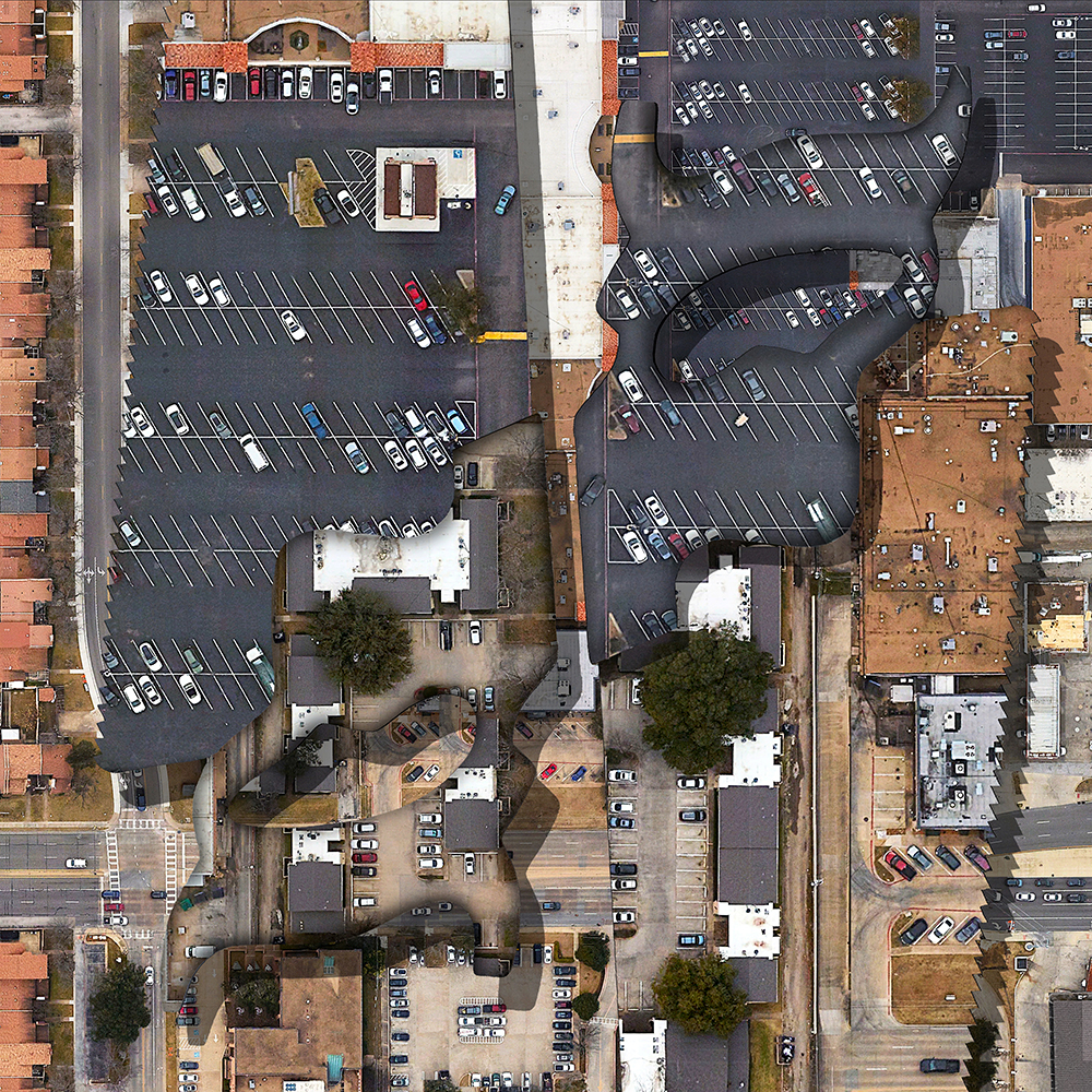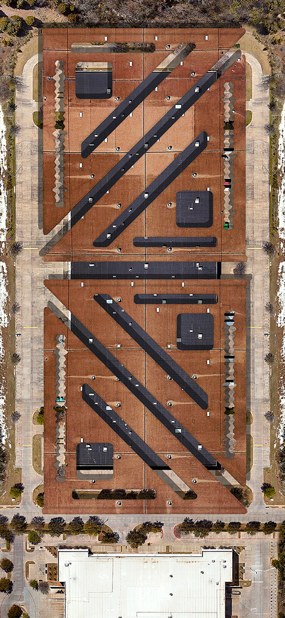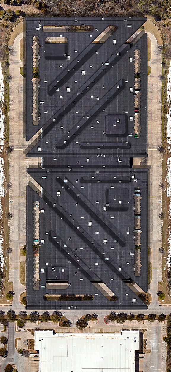 Parking lots, for instance, usually create empty and unsightly peripheries around downtown high-rise districts. Seen from above and rearranged with Photoshop, the lots in One Dozen (2023) form a beautiful urban mosaic. No longer representing emptiness, the reimagined parking lots can be seen with appreciation instead of disdain.