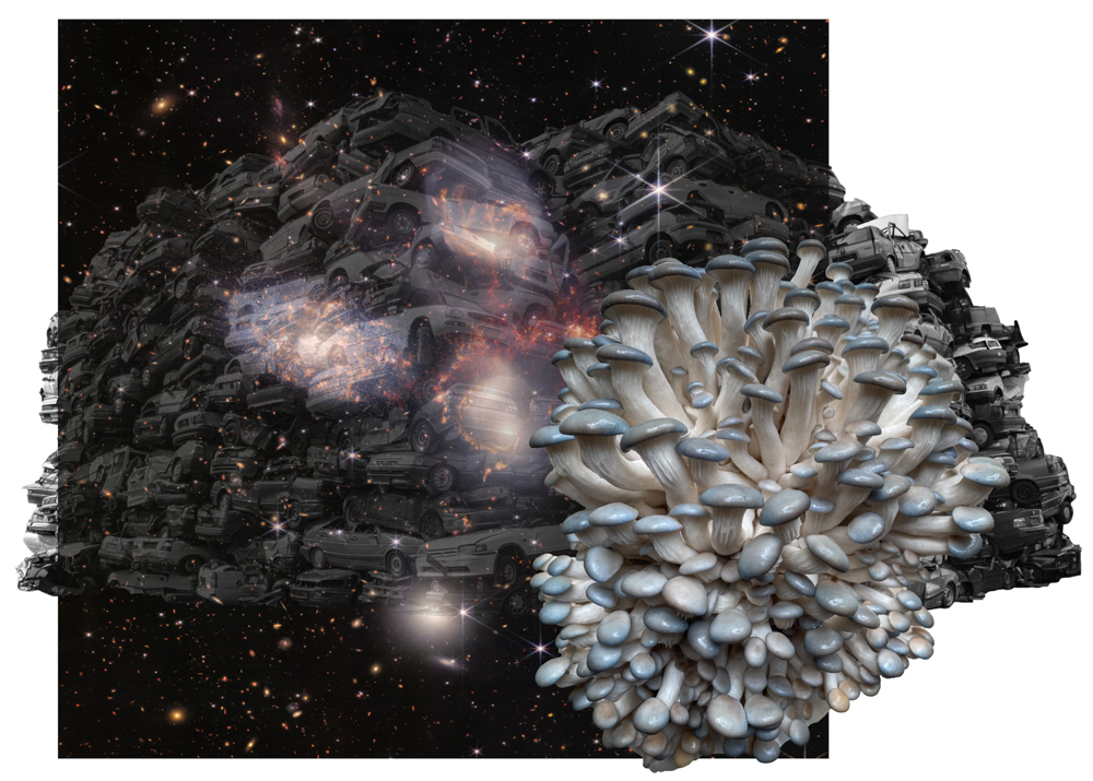 ©Florence Iff, heap of cars, mushrooms, James-Webb picture of the universe from Days of Future Passed