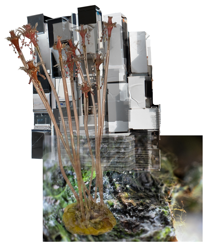 The primordial soup, however, continues to make new life possible, intermolecular forces evolve things still unknown to us, fungal spores fly to distant planets, and jellyfish unfold in their most perfect beauty. Time and space intertwine. Just as interdependence and interconnectedness of living beings have always existed, man- made materials additionally create novel adaptations and entanglements of the originally organic artificial and the solely organic.
