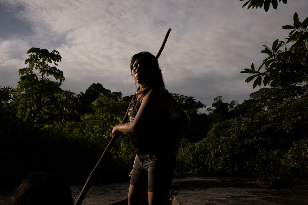 ©Tatiana Lopez, Alejandra Grefa paddles her canoe to her chakra (small garden) across the river Pindoyaku in the Atatakuinjia community, 2022. For the Sapara, the river provides a means of transport, it is a vital source of food, and it is the place where people from the communities bathe. Spiritually, the Sapara believe water is a living spirit, and they must maintain a balanced relationship with it.