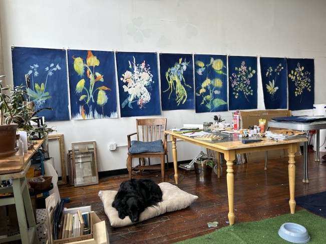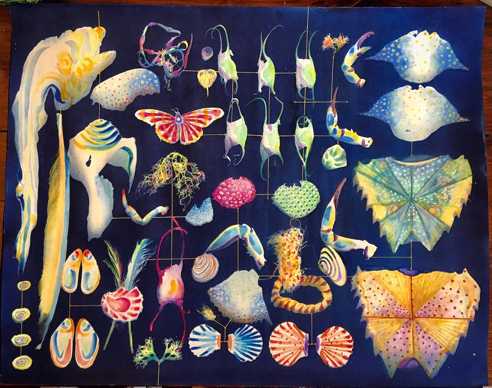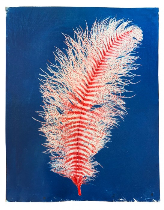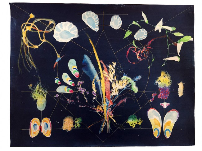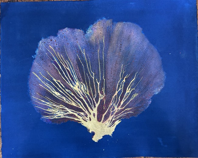 Her current work with hand-painted cyanotypes combines early-process photographs, paintings on paper, and objectless sculpture. Each object is collected, pressed flat until dry if necessary, printed in the sun, washed and dried, and finally painted—a process that can take months to complete. The dried and flattened specimens allow for sharp detail and translucence that informs the painting.