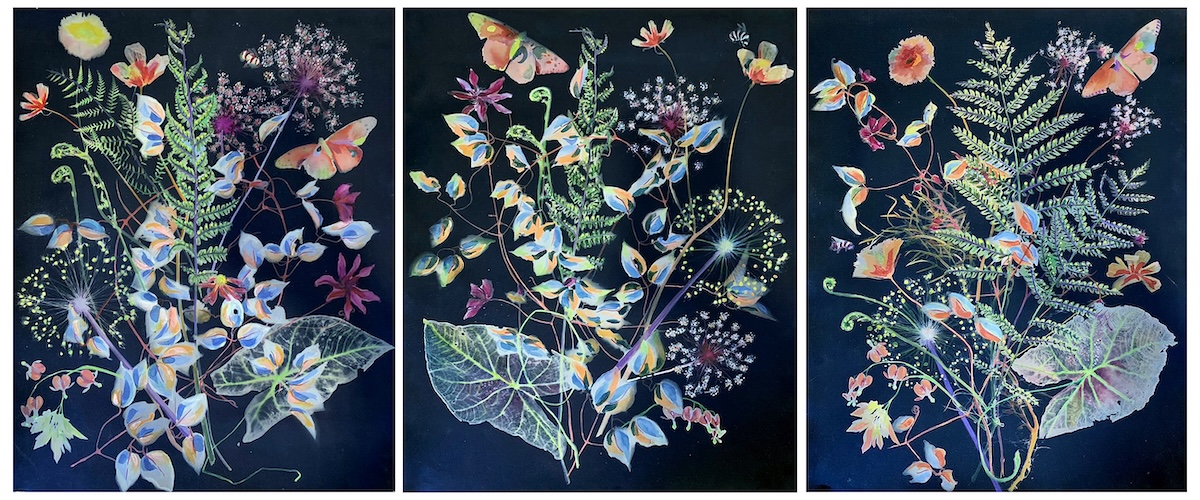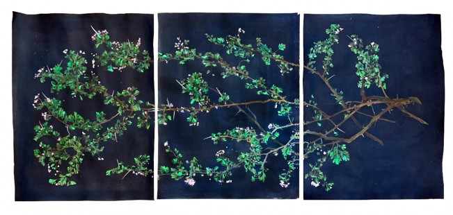 ©Brett Day Windham, Hawthorn Triptych, 2022, coffee-toned cyanotype, watercolor, and gouache on paper, 22 x 30 inches each