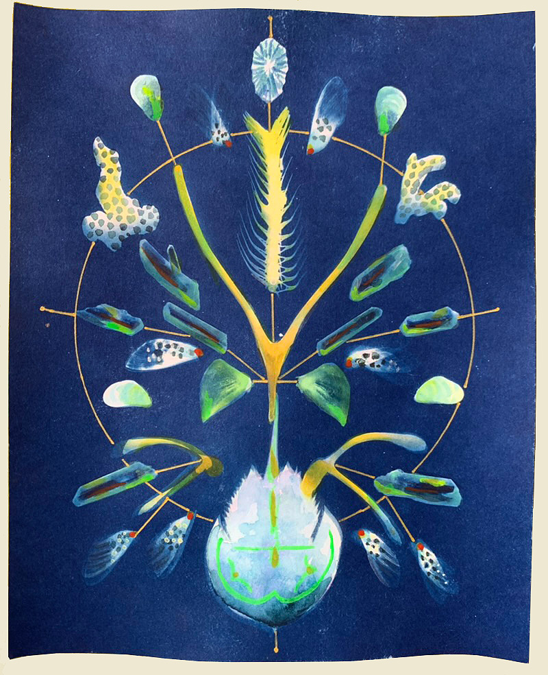 ©Abracadabra, 2022-3. Coffee and tea toned cyanotype, watercolor, and pen on Strathmore watercolor paper. 12×14 inches.