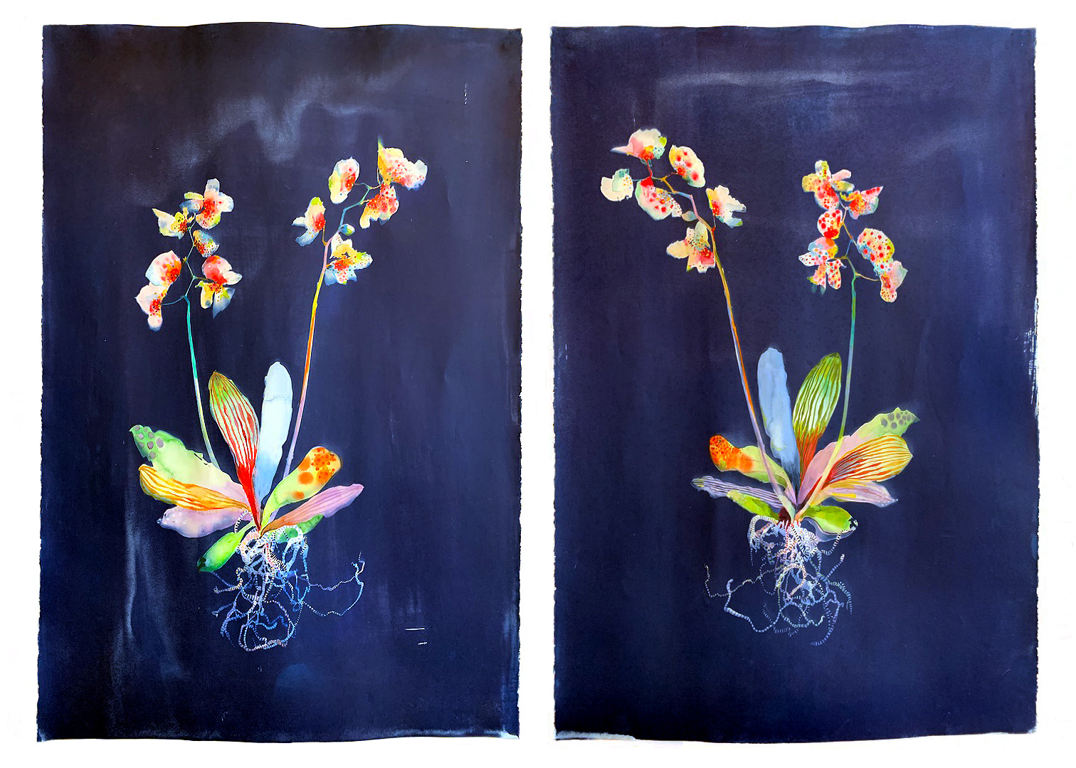 ©Brett Day Windham, Tropicalia Diptych, 2020, Watercolor, gouache, and cyanotype on Strathmore hot press, 26 x 40 inches each