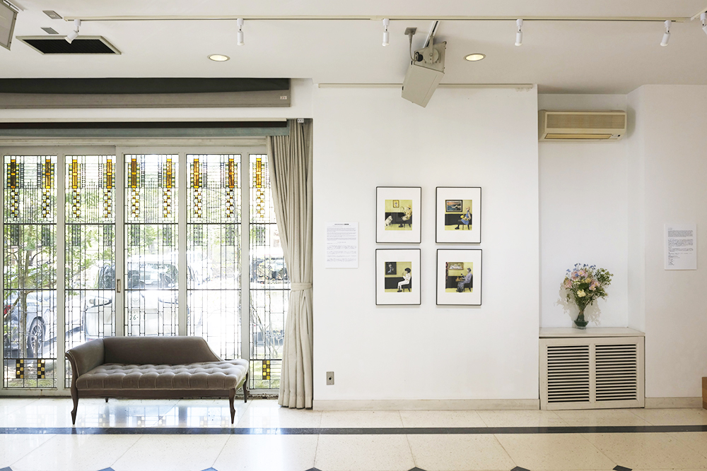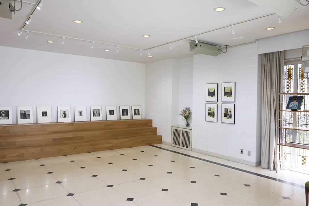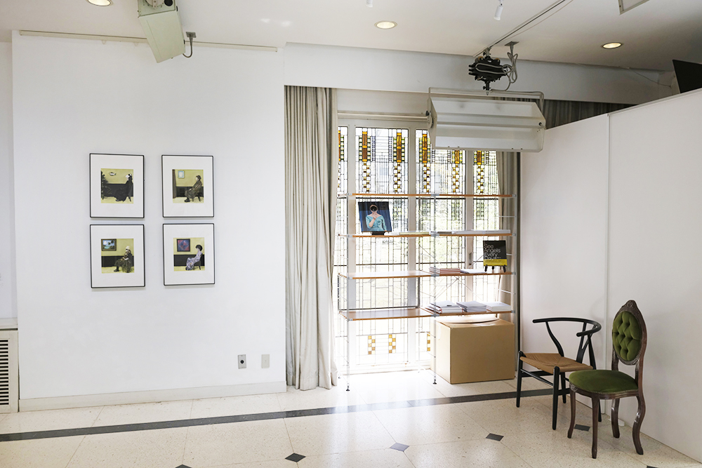Junko Yokota in front of her photograph and also work by Susan Sawyers, Shimazaki Jun, Chie Oshima, Kenji Takeuchi, and Haruka Takenaka