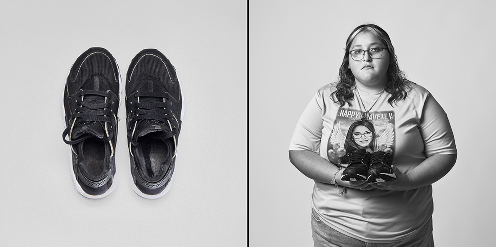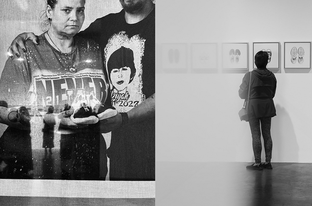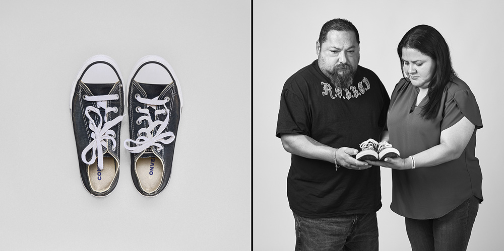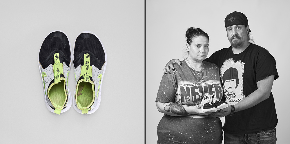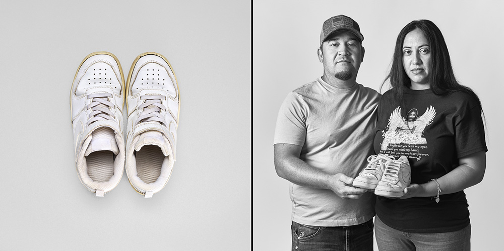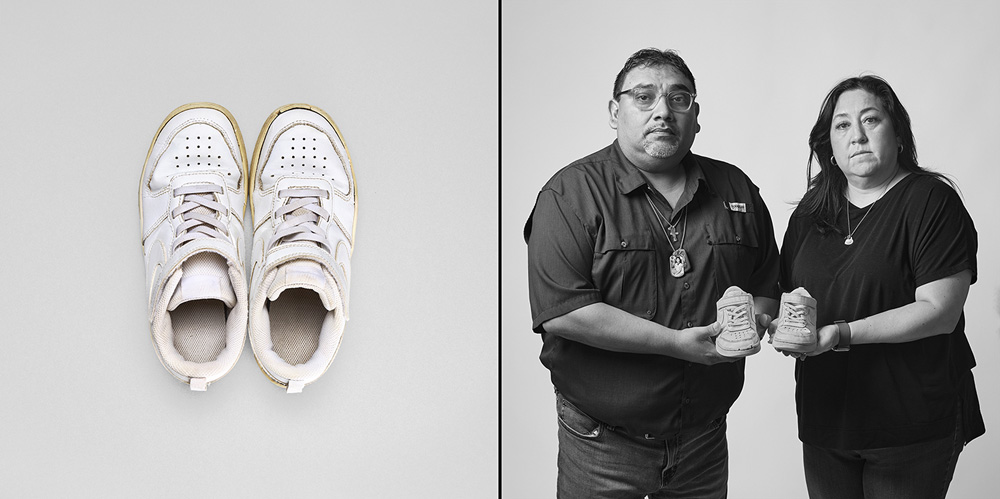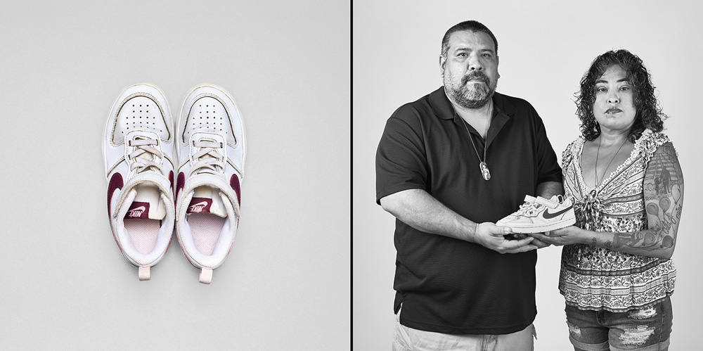 77 Minutes in Their Shoes, serves as an extension of my socially engaged practice which surveys our exposure to gun violence in the USA through photography and installation. Thirteen of the twenty-one families chose to participate in the project. 77 Minutes in Their Shoes features twelve color photographs of the shoes the Uvalde children were wearing at the time of their deaths. A teacher’s running weight vest, which closely resembles a bulletproof vest, was also included. The shoes and vest were photographed as a straightforward document and as evidence of this tragic event. The still-life photographs are paired with black and white photographs of the family holding the shoes and vest. These intimate portraits reveal the families’ vulnerability, resiliency, anger, and hope for a better outcome through their participation in this project.