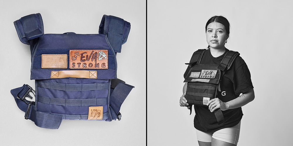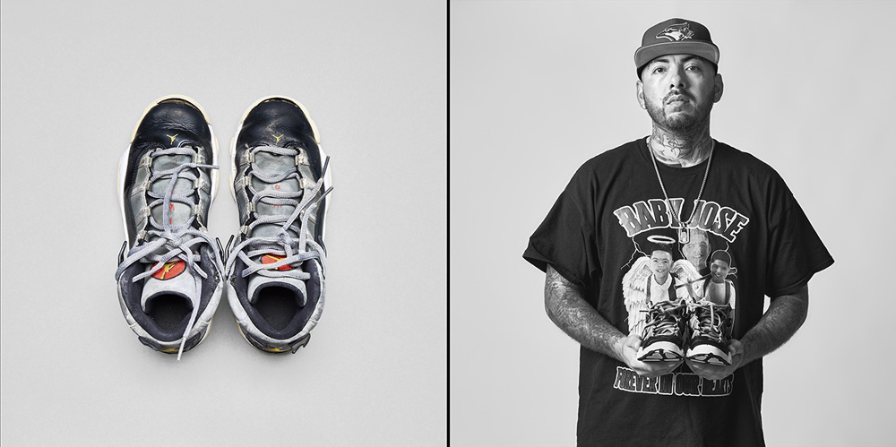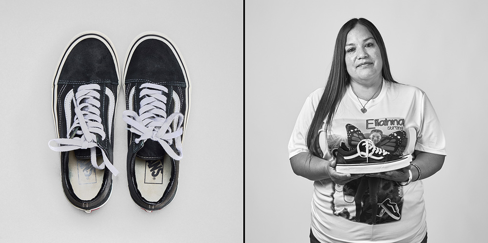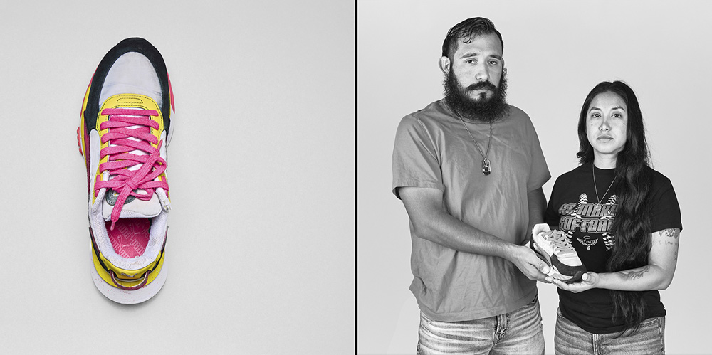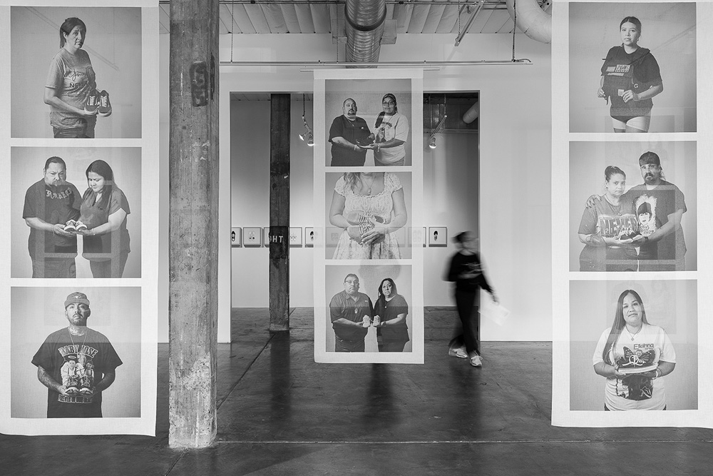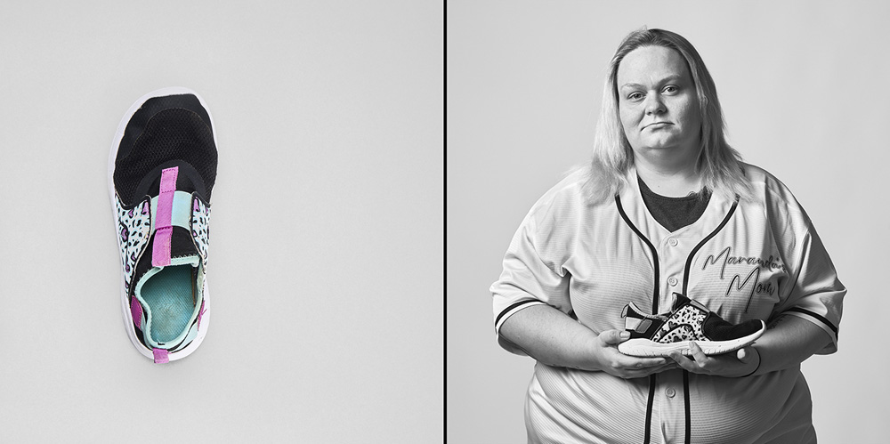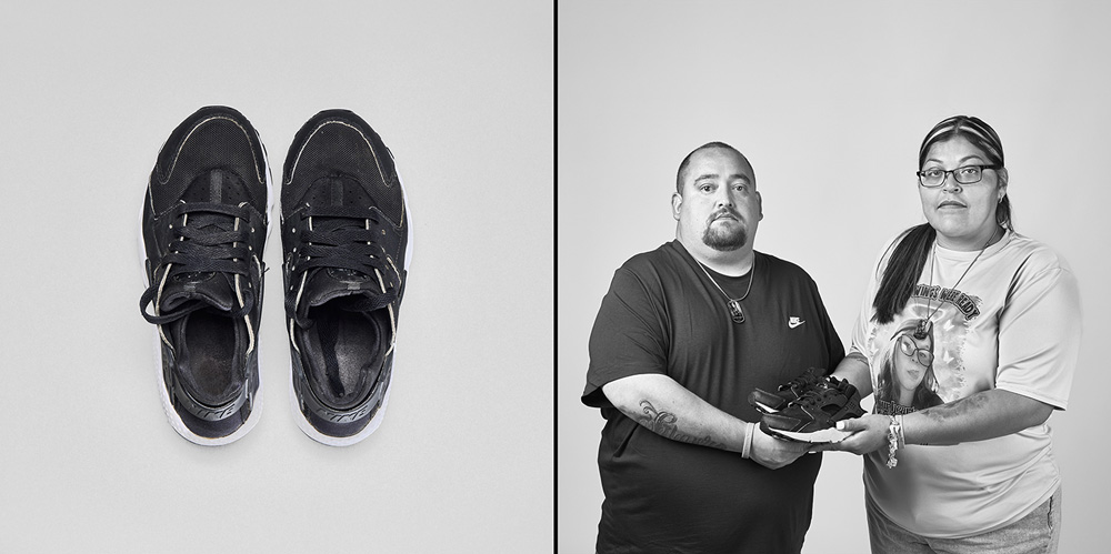 77 Minutes in Their Shoes, serves as an extension of my socially engaged practice which surveys our exposure to gun violence in the USA through photography and installation. Thirteen of the twenty-one families chose to participate in the project. 77 Minutes in Their Shoes features twelve color photographs of the shoes the Uvalde children were wearing at the time of their deaths. A teacher’s running weight vest, which closely resembles a bulletproof vest, was also included. The shoes and vest were photographed as a straightforward document and as evidence of this tragic event. The still-life photographs are paired with black and white photographs of the family holding the shoes and vest. These intimate portraits reveal the families’ vulnerability, resiliency, anger, and hope for a better outcome through their participation in this project.