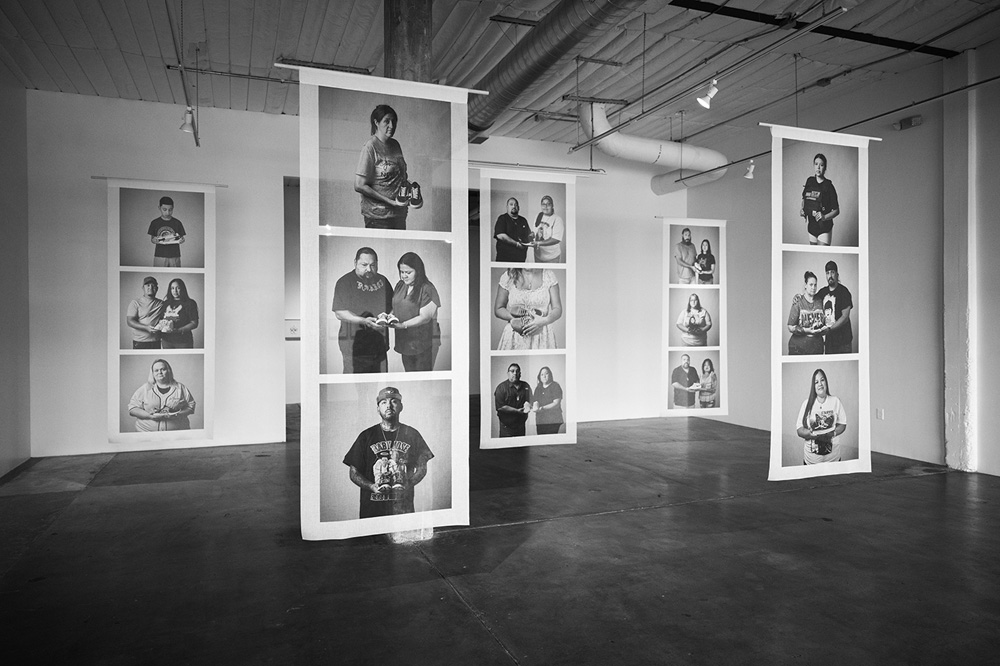 For a recent installation of 77 Minutes in Their Shoes, I chose to print the shoes and vest to scale and frame them in simple floating pine boxes. The children and teachers are never coming home. This is a fixed reality. The family portraits were also printed nearly life-size on sheer fabric resembling vertical banners. Audiences subtly moved the portraits as they navigated around the families before reaching a small room housing the photographs of the shoes and vest. Audiences were confronted again with these images as they exited the space. The threshold from safe to unsafe and citizen to survivor is growing smaller every day. These banner portraits serve as the ongoing faces of gun violence in America.