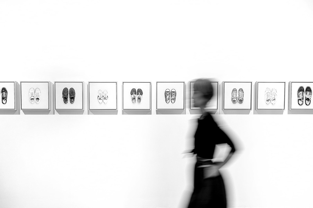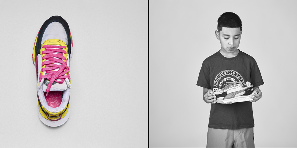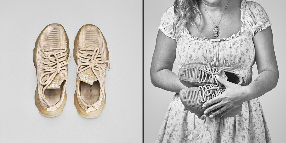 MEDIUM: I hope to create two versions of this project to accommodate unique sites. One version has already been created as seen in the additional file uploads in the work samples. This recent exhibition version included five, 8 foot by 43 inch vertical black and white dye sublimation triptychs on fabric and 12, 15×15 archival color pigment prints on Hahnemühle Baryta mounted on Dibond and framed in a floating pine frame and 1, 17×17 archival color pigment print on Hahnemühle Baryta mounted on Dibond and framed in a floating pine frame. The second version of the project will exist as diptychs sized at 28 x 14 inches framed in either the pine frame but with museum plexiglass for protection or a white minimal frame with museum plexiglass. The diptychs will be a combination of one half color for the shoes and the other half black and white for the portraits.