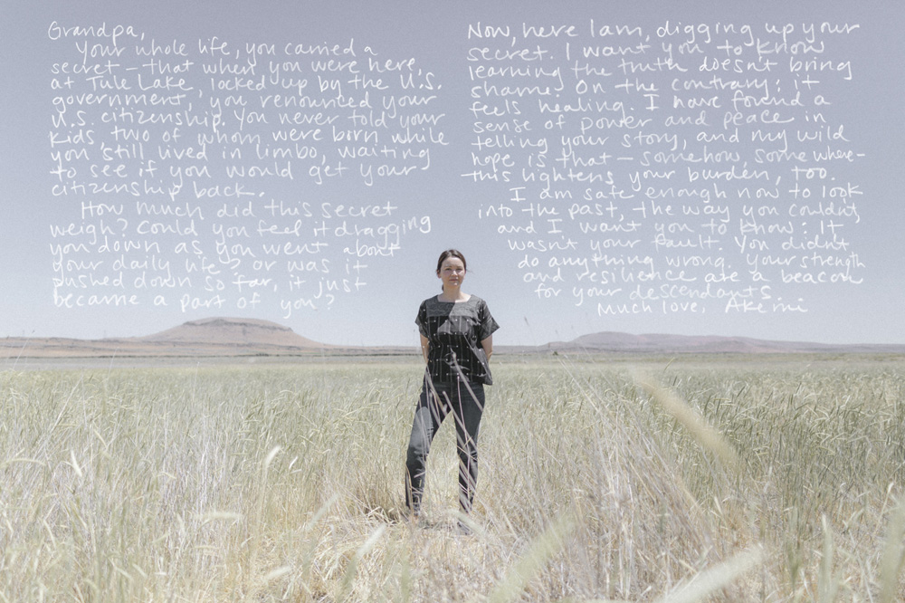 ©Haruka Sakaguchi, Akemi Johnson’s grandfather was one of 120,000 people of Japanese ancestry who were forcibly displaced and incarcerated during World War II. Her grandfather was removed from his home in Isleton, CA and incarcerated at Tule Lake. Akemi revisited her grandfather’s former camp and wrote a letter to him in commemoration.