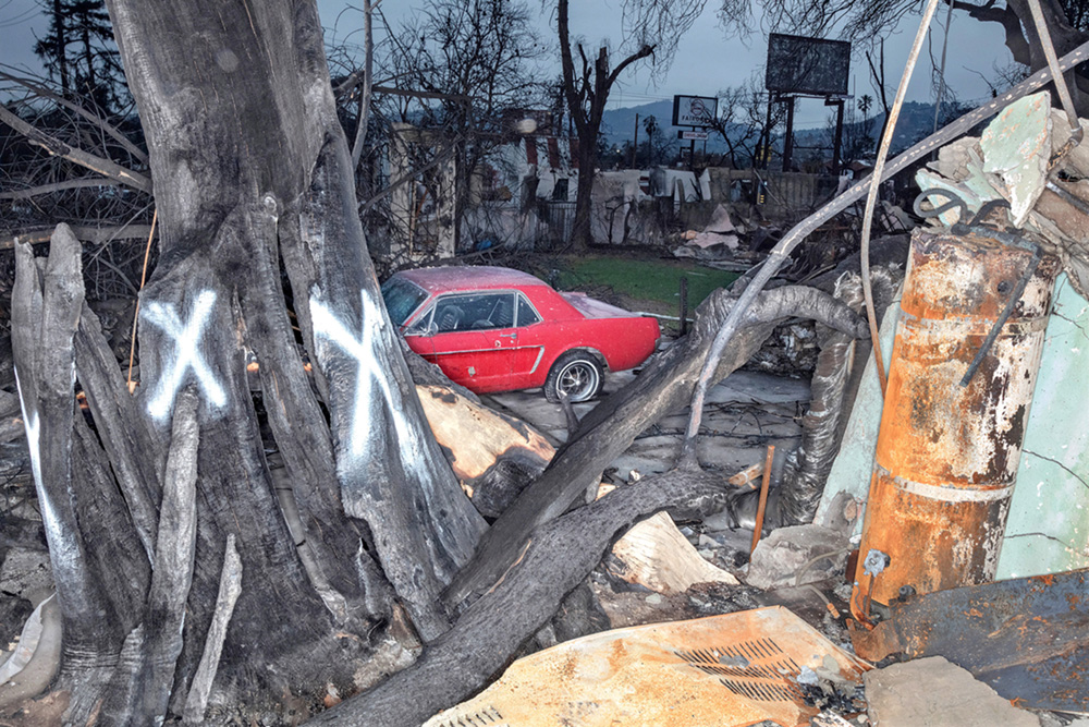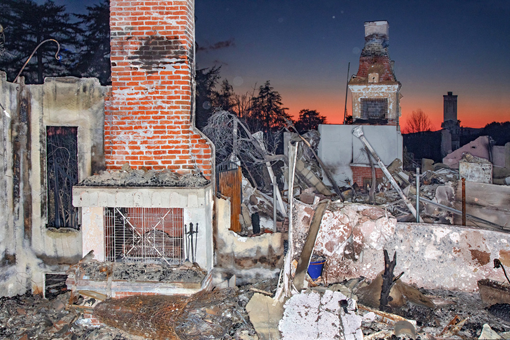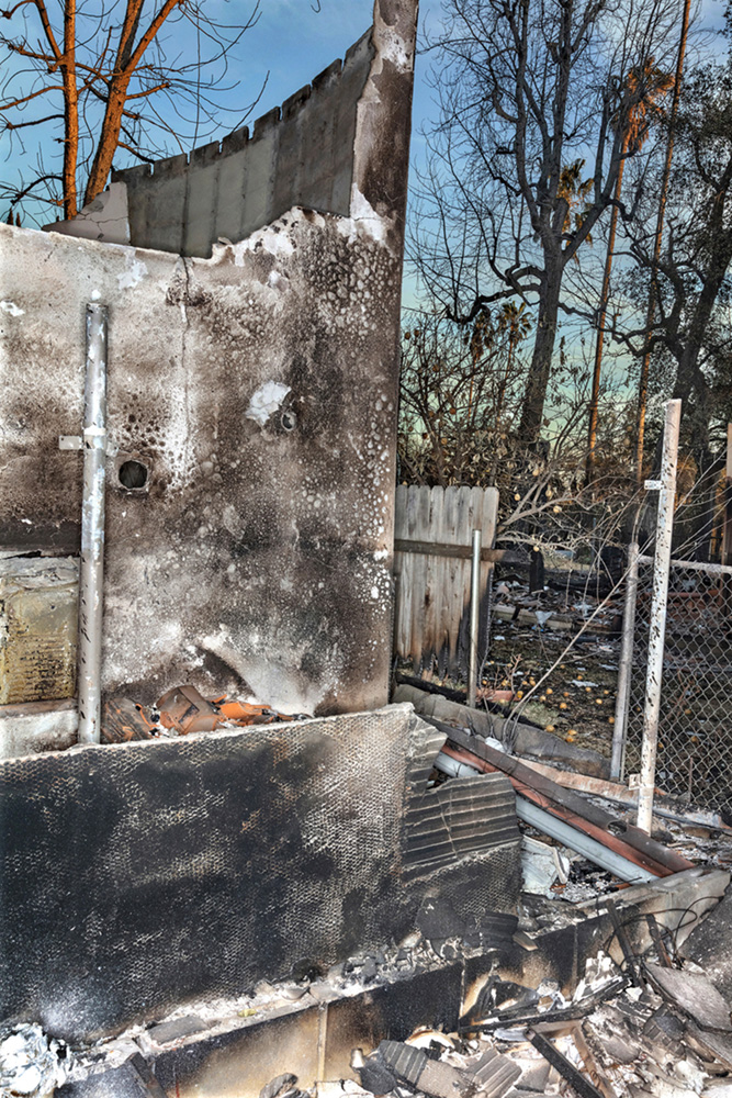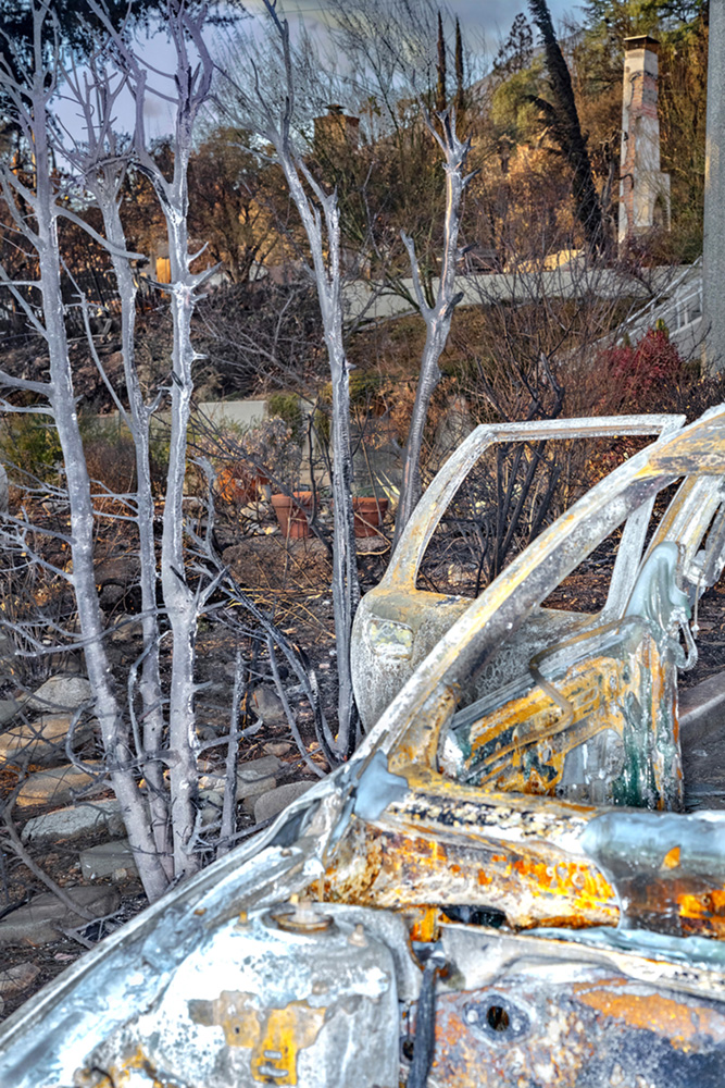 The houses and yards I walked through were unguarded, despite the televised concerns of local police chiefs and mayors that looting was likely. Anyone following my footsteps through the rubble would’ve realized there was absolutely nothing there to loot. The devastation was complete, and awesome in its way. As any photographer might, I’d expected to find occasional picturesque objects, momento mori, in the ashes––a family picture, a rocking chair, a case of trophies––but all that had been obliterated, utterly, by the ferocious heat of the holocaust, as if a bomb had dropped.