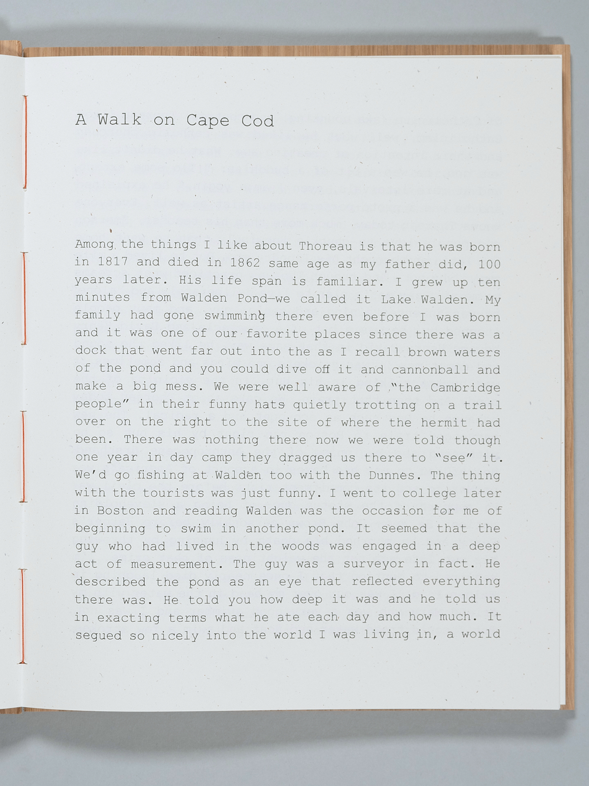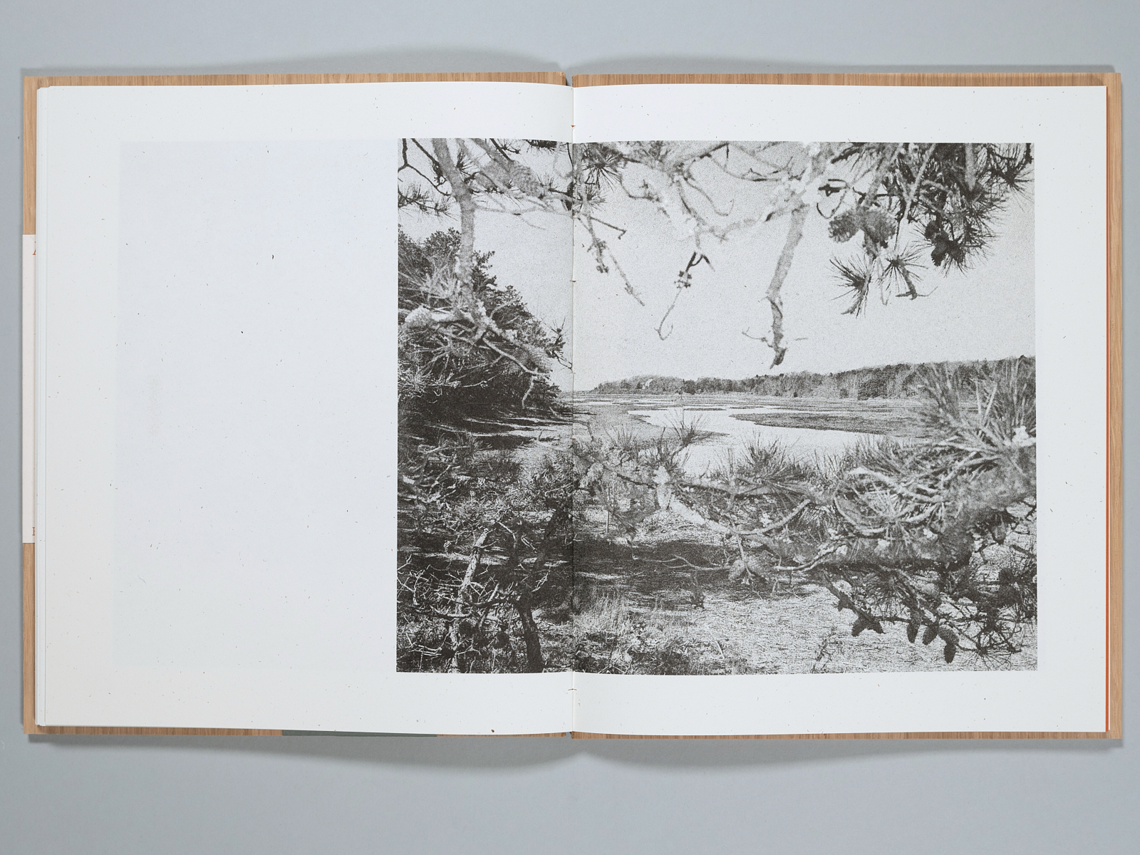 A Walk on Cape Cod gathers the writing of Eileen Myles and photographs of Cole Barash on the occasion of their 32 mile walks along the Cape Cod shoreline, 170 years after Thoreau did it and wrote about it and though like him they chronicle the flora fauna shoreline ocean people dogs ghosts thoughts feelings sand collapsing houses sculptures wonder pain sound color etc. Cole and Eileen’s versions are something oblique to his and less linear, less singular, granular or more like a palimpsest and with depth like that, like sediment, dissembling, grains of sand, fog, photographic grain, grain from the Riso, bark fibers in the paper, trees already the paper, wood covers…