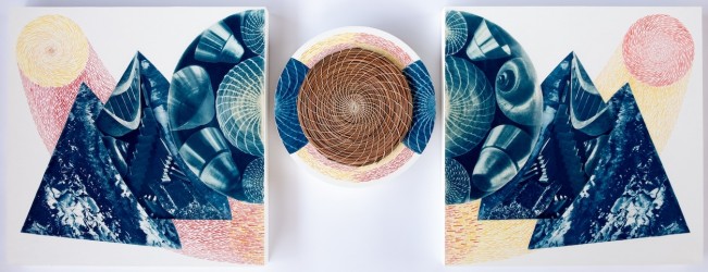 AL: Locus is perhaps the most complex piece I have ever created. For the cyanotype portion, I toned it with alternating chestnut tannin and soda ash baths. The primary structure is composed of three layers of wood that I hand-carved, spanning geometric to organic shaping. I then painted grey palm shadows and pops of color with flashe and watercolor. The center circle holds a drop of cuttlefish-cast bronze, which is one of the most ancient forms of metal-casting. Near the bottom of the work is a sculpture that I hand-formed from wax and then cast in glass, (it is an abstraction of lymph nodes) which is held in place by bronze wire.