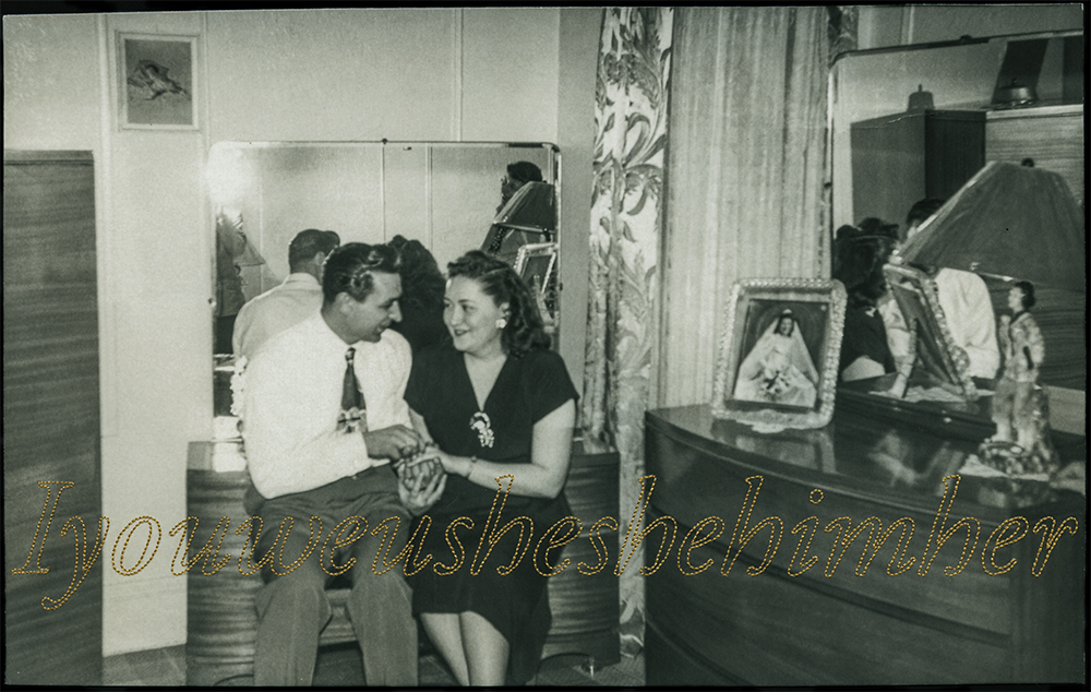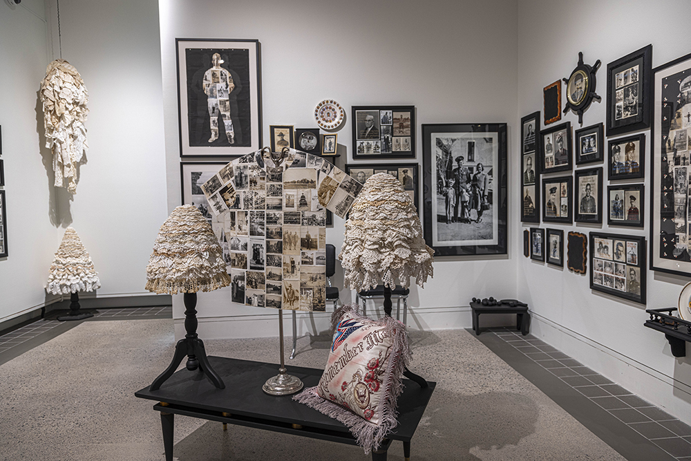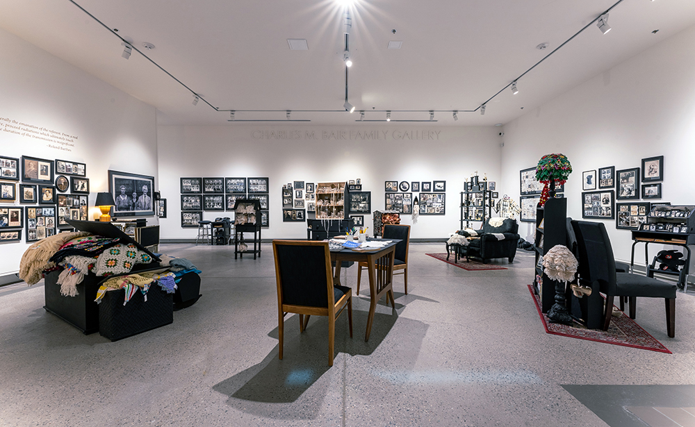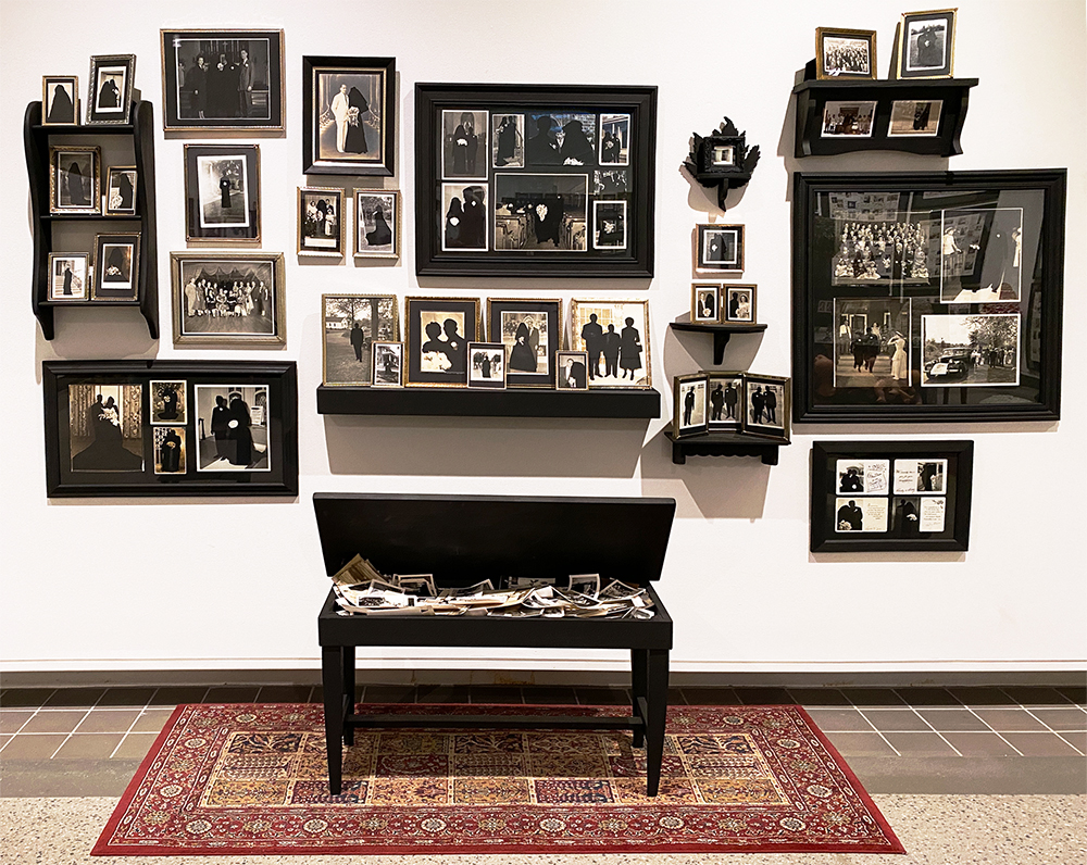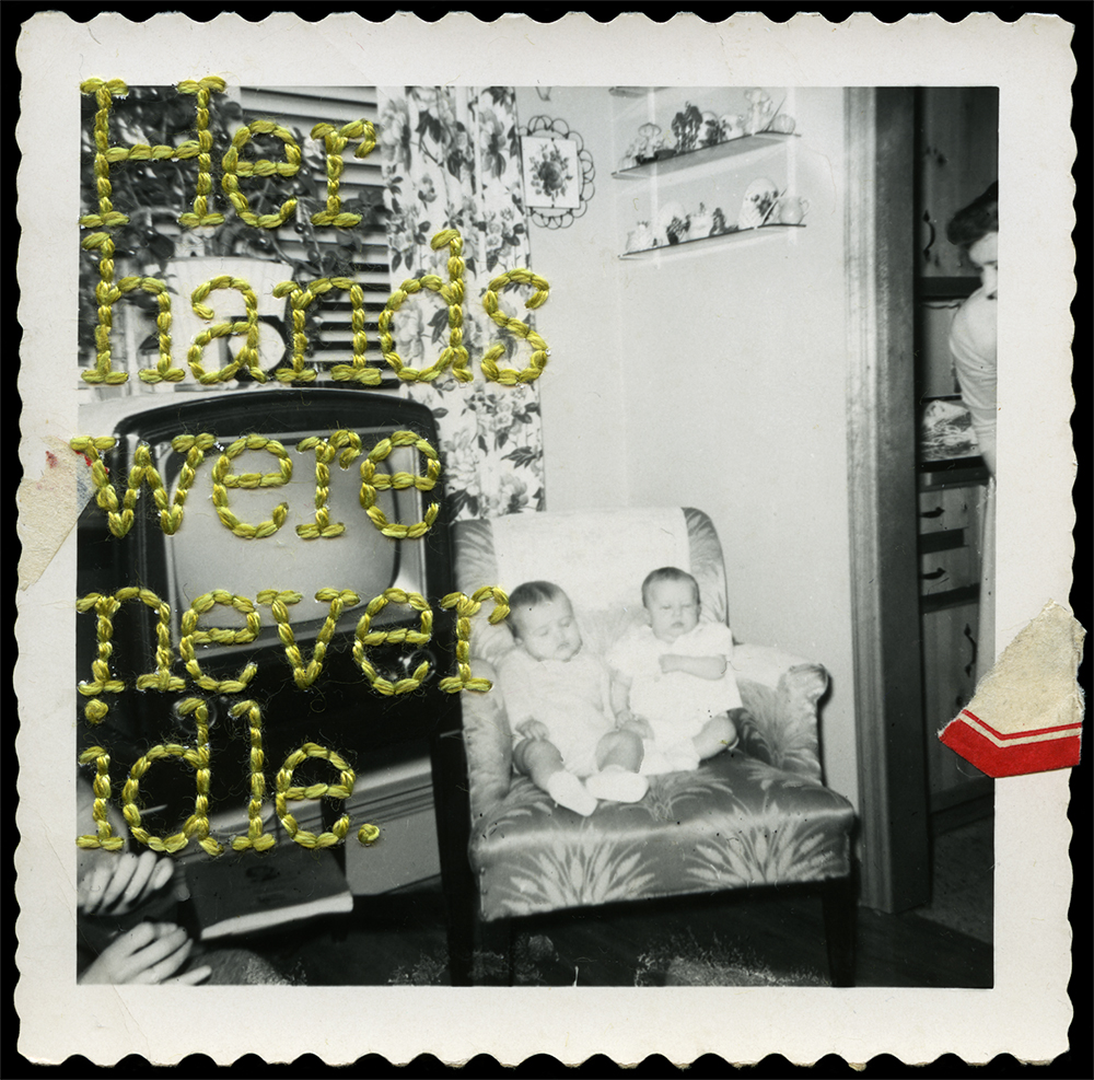 The viewer continually shifts their awareness between the facial expressions and vintage styles represented in individual images, the content of the stitched tributes, the details of the stitching, and the overall installation. Accompanied by mid-century furniture, knickknacks, and mounds of found hand-crocheted doilies and afghans, the installation alludes to the familiar spaces of homes and offices. The repetition of standard frames and hand-stitched texts imposes a formal framework that contains and unites the sentimental artifacts. This accumulation of collected and remixed memories calls attention to the universal aspects of human experience.