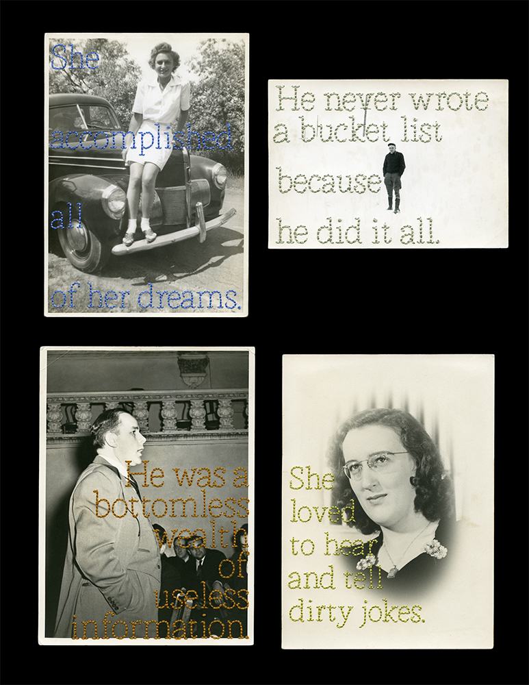 “Remember me. a collective narrative in found words and photos” is my effort to show, in these divisive times, that more connects than separates us. I began it in 2015, stitching sentences copied from obituaries written by loved ones into found photos of others that I felt fit. I’ve stitched over 1200. They developed into an immersive museum installation.