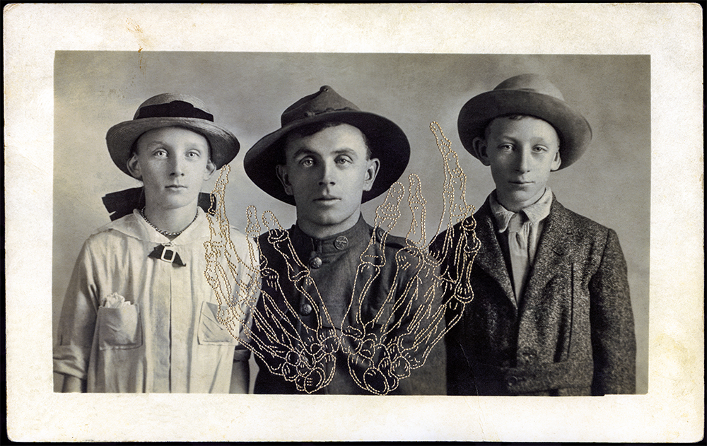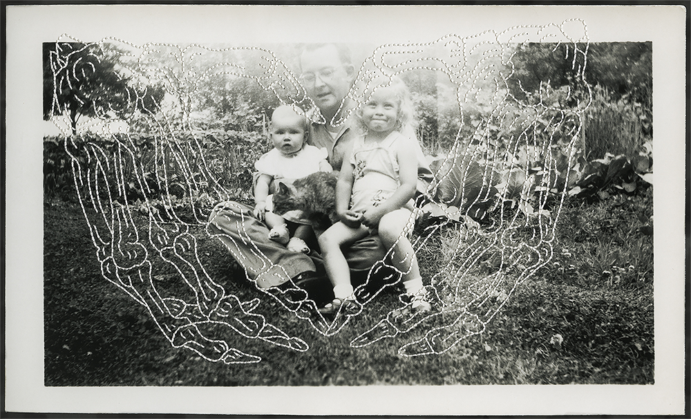 I’ve spent many years “making friends with death” because I learned at a young age that it can happen any time to any one. In my “memoji mori series” I hand-embroider skeleton hands into vernacular photos. Their gestures are familiar because they are based on hand emojis. I create a juxtaposition of a commonplace photo with an expressive hand gesture, encouraging the viewer to decipher possible meanings. Dia de los Muertos, the vibrant celebration of both life and death with its most ubiquitous symbol, the skeleton, has inspired and consoled me for many years.