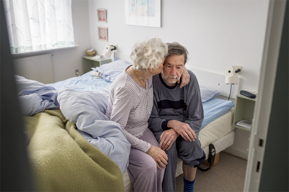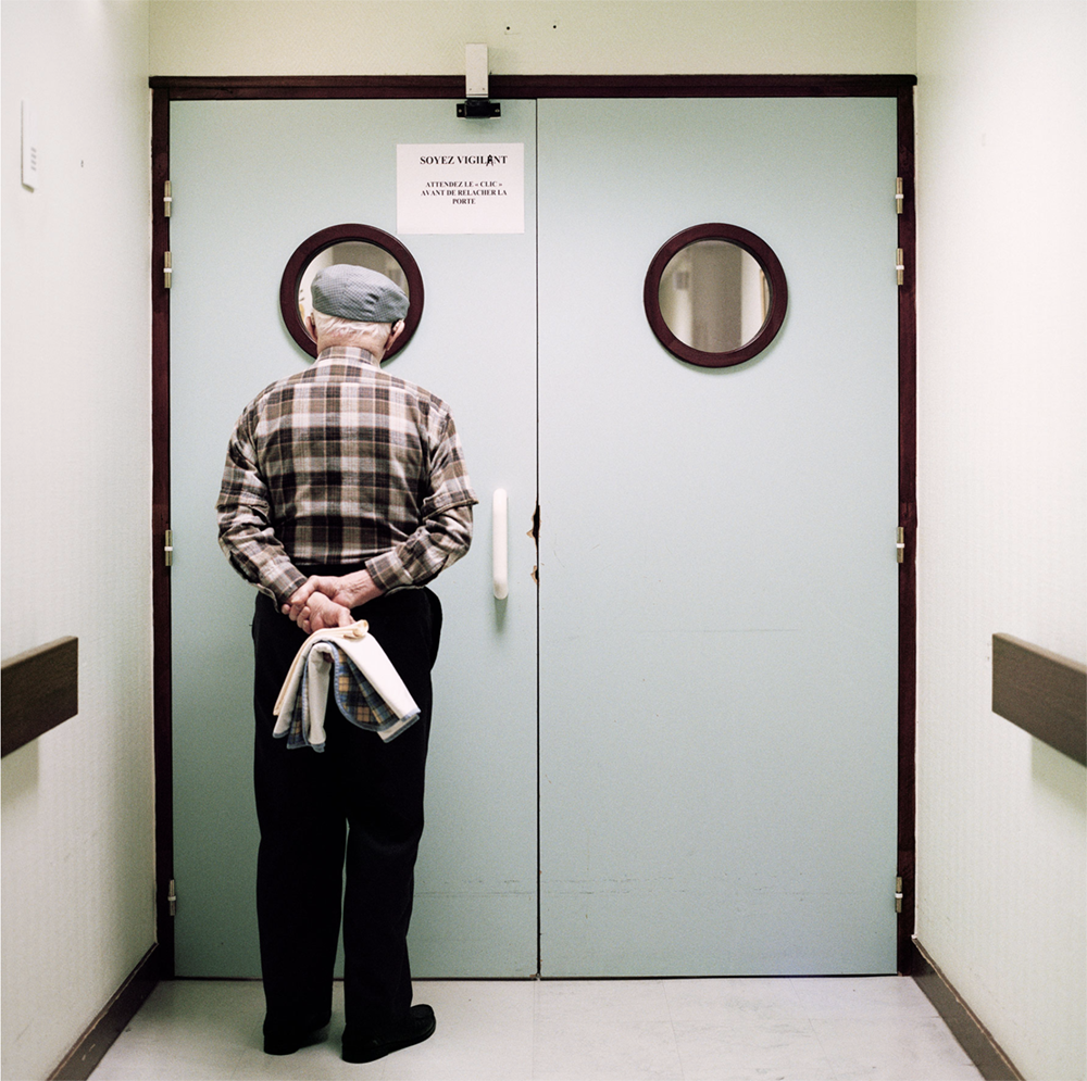 Into Oblivion by Maja Daniels, 2016 BOB AND DIANE FUND GRANT recipient , Resident stands in front of the ward’s locked exit. Doors and blocked passing’s are disturbing elements to a person suffering from Alzheimer’s due to the common symptom to regularly often wander about. As a result of the potential risk of getting lost, the ward is confined for security reasons according to the « principle of precaution.