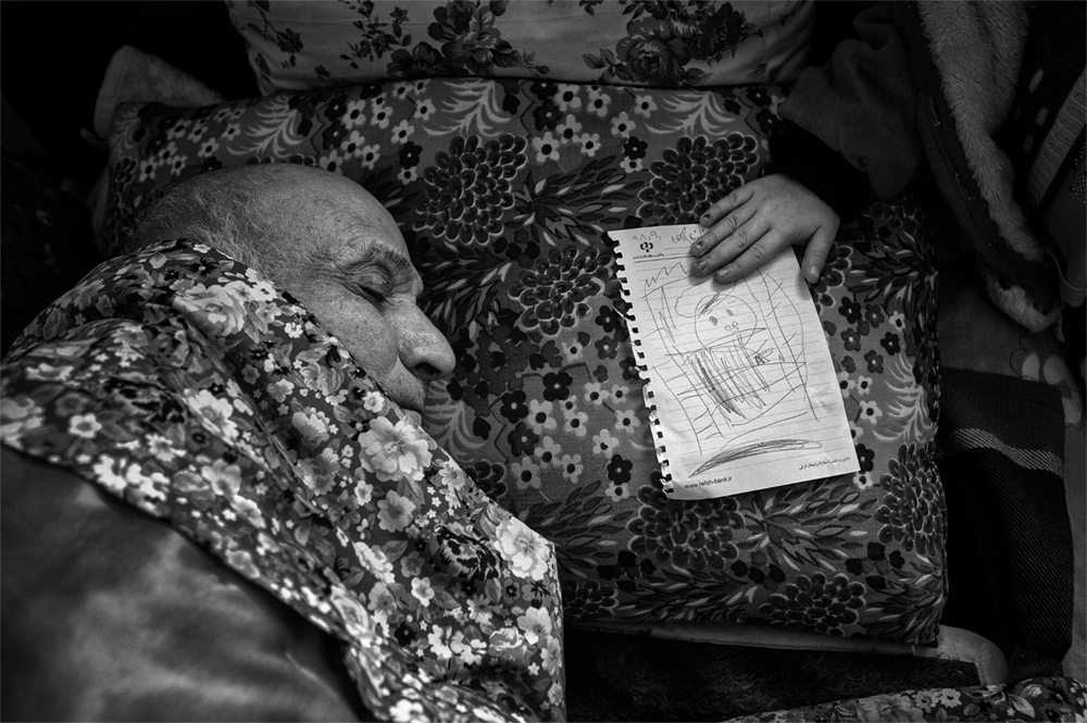 The Loss of Oral History by Jalal Shamsazaran, Recipient of 2020 BOB AND DIANE FUND GRANT recipient, My dad is sleeping more these days. Helen is his youngest grandson. He’s four years old. He painted his grandfather sleeping and wants to show him.