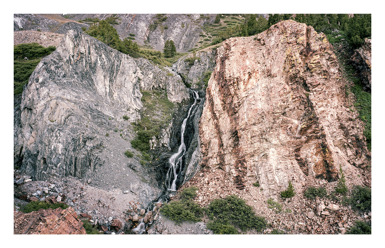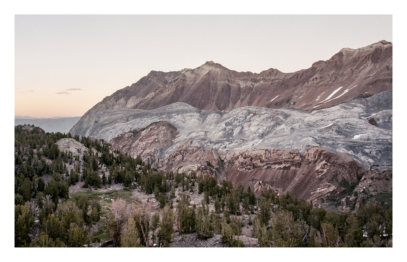 BL: In many ways, Mountain Folds is a transitional project in that I made the photographs long before I thought about making it into a book. During this time, I was interested in pushing myself further to develop a more conceptual landscape project that went beyond the traditional picturesque. I chose to focus on one particular area of the Eastern Sierra Nevada mountains where the exposed layers of geology could tell a story about geologic time in relation to the landscape. Over one summer, I repeatedly returned to this canyon to photograph a massive band of gray rock that stretched across the landscape, making several 3-5 day backpacking trips and carrying both my large and medium format cameras (I was in better shape back then). I researched geologic maps and satellite imagery to identify potential viewpoints and plan these trips, and so the comparison between maps and the physical reality of the place was also interesting to witness. Many of these images could have been easily made with drones but it was important to me to physically go to these places as a way to maintain a grounded connection to the photographs. The book form became an ideal way to combine the photographs with ideas around mapping, satellite representation, and my physical encounter with the landscape through personal writings.