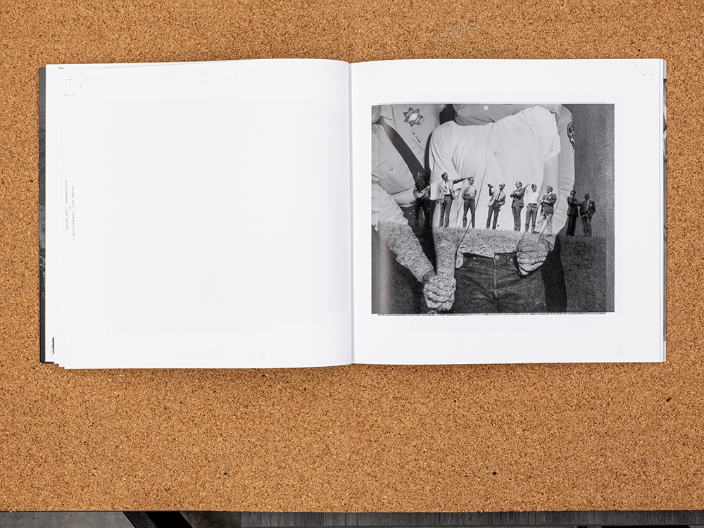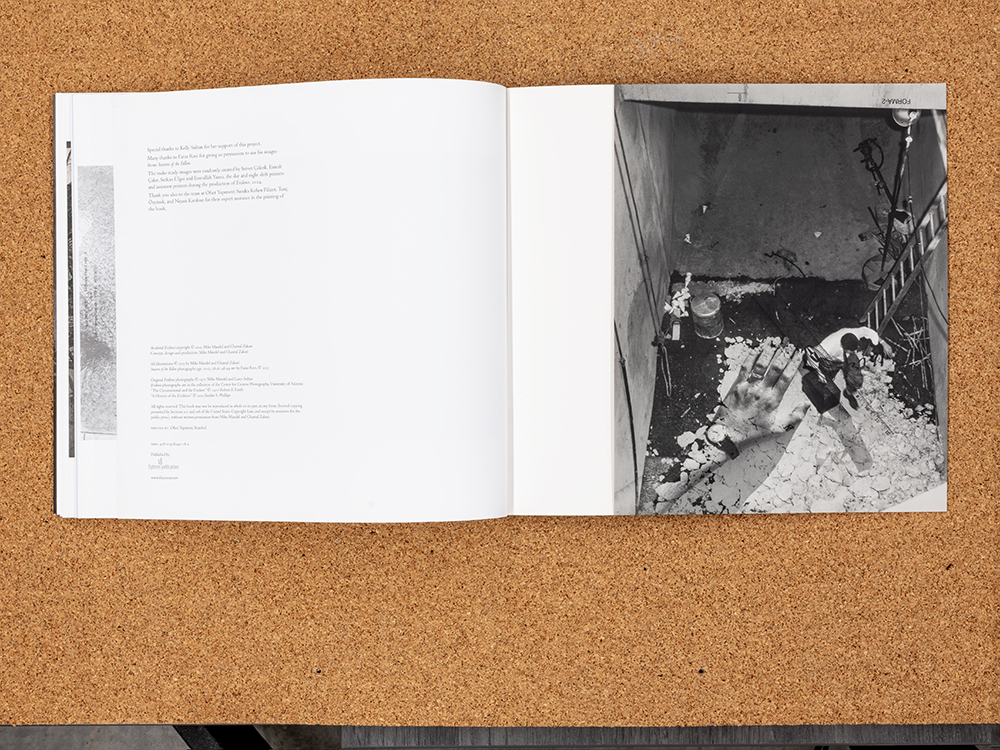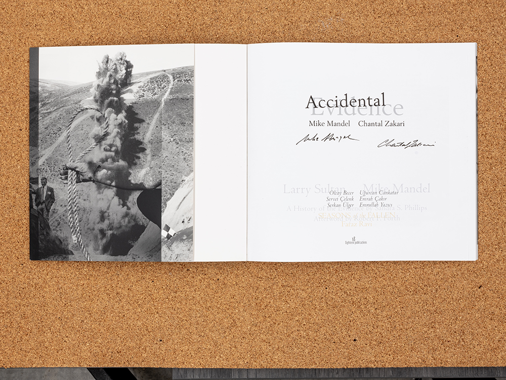 Accidental Evidence (2025) by Mike Mandel and Chantal Zakari directly engages with this gap in time, exploring how accidents and material processes can generate new meaning. The book is built from “make-ready” sheets discovered during the press run for the fifth printing of Evidence in Istanbul. These sheets, used initially to calibrate ink and alignment, bear layered images—sometimes from Evidence itself, sometimes from Faraz Rafi’s Seasons of the Fallen. The result is a visual palimpsest in which content overlaps, collides, and is partially obscured, producing pages that are at once dark, confusing, and richly textured. What emerges is an accidental collaboration across time and authorship, in which the past and present interact.
