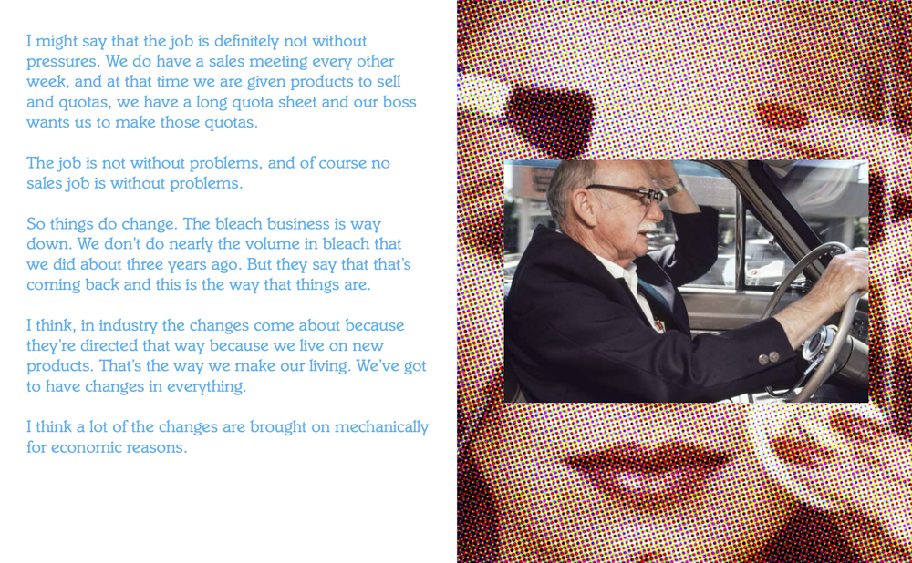 I incorporated images of ads in the original slideshow but when we were putting the book together we had the idea of making the ads more abstract and placing them as a backdrop to the car photos to highlight the incessant driving involved in covering his territory. Also this weaves the idealized beauty concept throughout the story. After living with this piece for 45 years, the sequence and its relationship to the dialogue seemed immovable to me. Clint (Clint and Alex Woodside are the publishers of Deadbeat Club) upended that completely. That took my breath away, but once I got accustomed to this new version I saw what he saw. Having new eyes on work can really wake things up. Plus a book works differently than a slide show. I trusted him and I think together we came up with a new way to tell what is actually a very old and familiar story of the merchant and his customer.