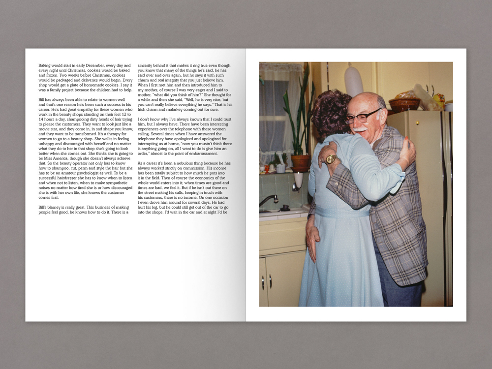 JD: Clint was definitely cuing off of the idea of a screenplay with his layout of the text. The dialogue flows along in a way that allows you to dip in and out of it. You can look just at the photos or focus on the storyline or do both at once. This encourages multiple readings of both text and image. When Dad’s voice is seen in bold blue you know he is reflecting on the business of business. This allows you to see him with more dimensionality. And seeing him at home with my mom, working late into the night at the dining room table or anxious in the bathtub, or packing up his car for another day, shows the inner workings of his job life.